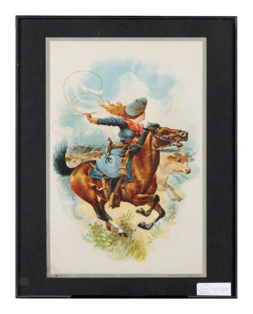 Colorful framed litho print of a cowgirl on horseback with lasso chasing cattle; image size approx. 12” x 8”; very good condition. Est.: $50-$75.