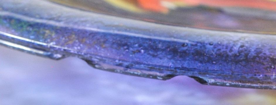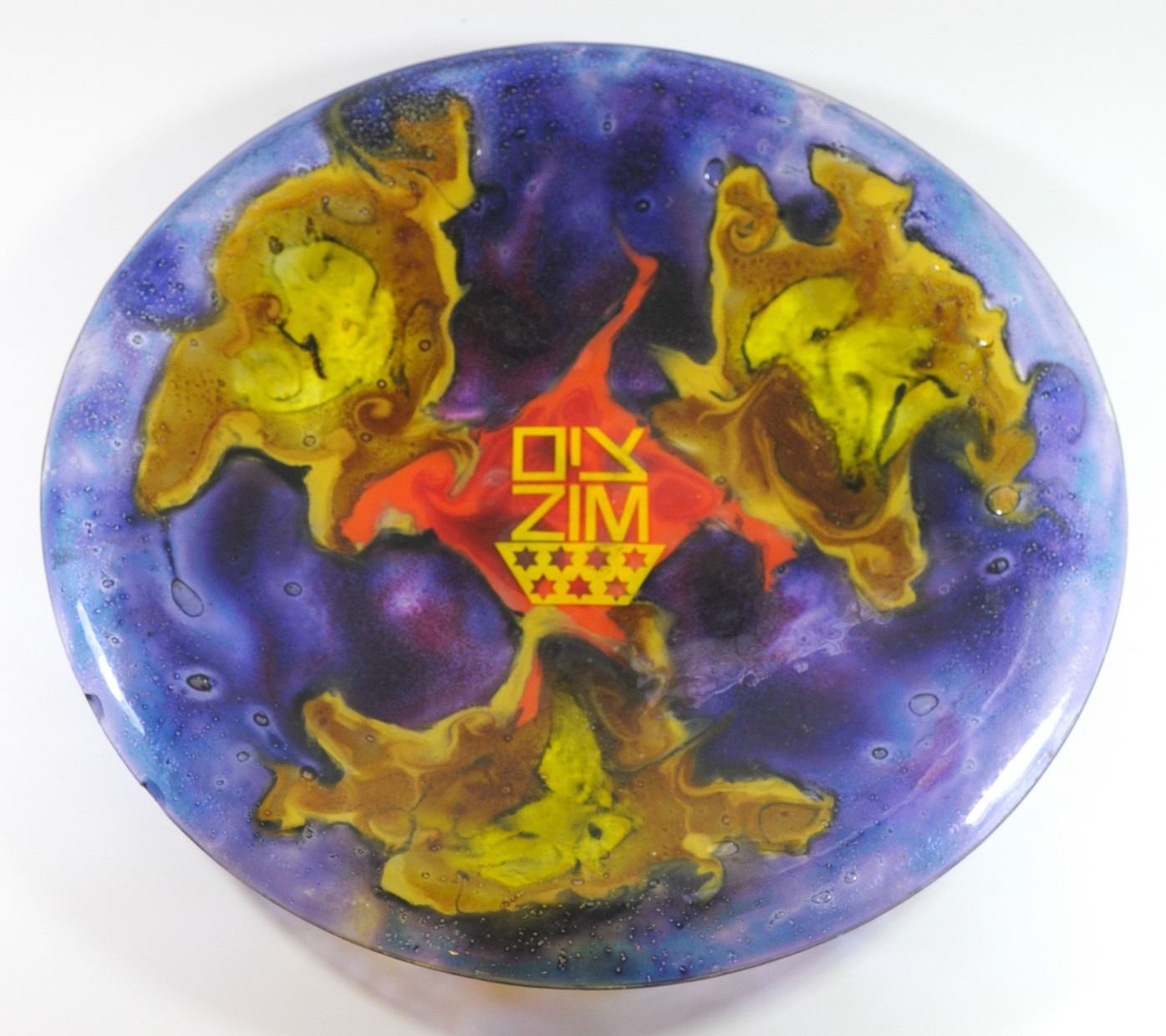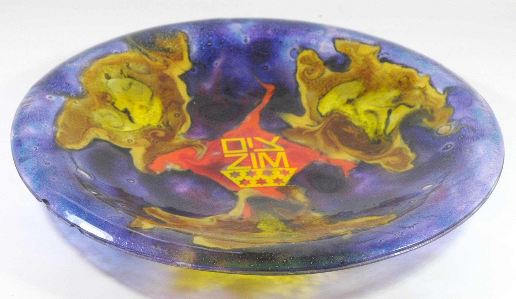 Colorful fruit bowl made by Zim for first class passengers , circa 1960s, with printed lettering and the company logo in the middle, two small chips in rim, diameter: 40 cm.