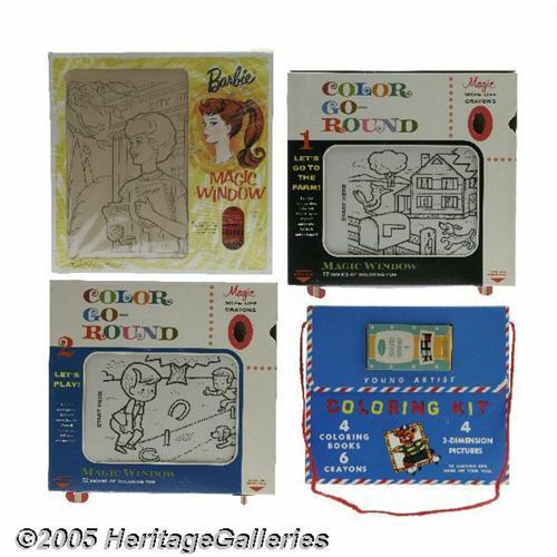 <B>Whitman Coloring Sets, Group of 4 (Various, 1953-74).</B></I> Color your world with these four marvelous coloring sets, including a ""Young Artist Coloring Kit,"" (1953); two ""Color Go-Round"" sets (1963),""Let's Go to the Farm!,"" and ""Let's Play!""; and ""Barbie Magic Window,"" (1964). The sets average in Excellent condition. <I>From the Random House Archives</B></I>. <BR><BR><B>Important notice:</B> Heritage usually auctions material at the rate of 200-250 lots per hour. On some occasions eBay Live bid software or the Internet may not be able to keep up with the pace of the auction. We recommend placing a realistic absentee bid now as insurance to avoid disappointment. Occasionally the auctioneer may eliminate or reject an eBay Live bid, and the auctioneer may also reopen a lot after the close of the eBay live bidding (usually because we missed an audience bid), and may reject your bid even if it shows you as the winning bidder. By bidding via eBay Live, you agree that Heritage may award the lot to another bidder at its sole discretion under the circumstances described above or any other reasonable circumstances. Since eBay bids are not shown to us until we open the lot on the floor, we treat those bids just like floor bids. In most cases the floor responds before the eBay bid is presented to us, due to Internet lag time, so for consistency we have made it a policy that floor bids are always considered first over tie eBay live bids. Also please note that all Heritage lots purchased through eBay Live carry a 20% Buyer's Premium. Please make sure you read the Terms and Conditions before you bid. This lot is being auctioned in conjunction with a live floor auction by Heritage Galleries & Auctioneers. All final auction and invoice information will be supplied by Heritage Galleries & Auctioneers, and all other information should be considered preliminary. Lot:3284 <BR><BR><B>Winning Notification and Billing:</B> After the FINAL session in this auction is complete