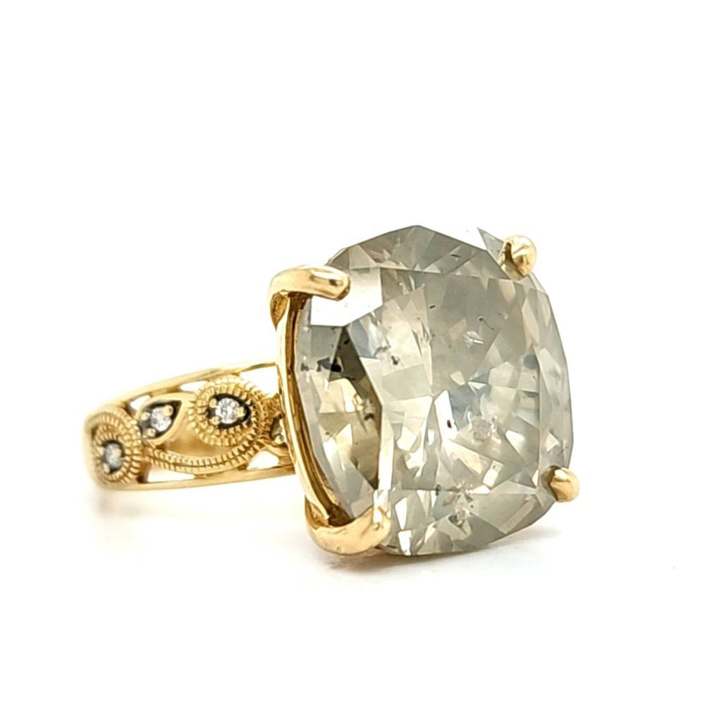 ADDITIONAL INFORMATION: This is a 14 karat yellow gold ring that showcases an incredible fancy colored diamond. The diamond is described in a GIA Colored Diamond Report as Fancy Gray-Greenish Yellow with evidence of internal laser drilling (to improve the clarity of the diamond). The diamond color appeals to the earth tones and the diamond has yellow and green fire in its brilliance. The diamond is prong-set in a fancy head with scroll work and is additionally supported with a head basket. The shoulders of the ring have round, brilliant-cut diamonds that are bevel-set. The ring has an approximate 2.7mm shank.