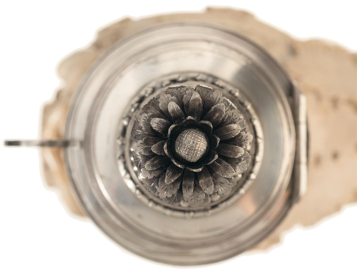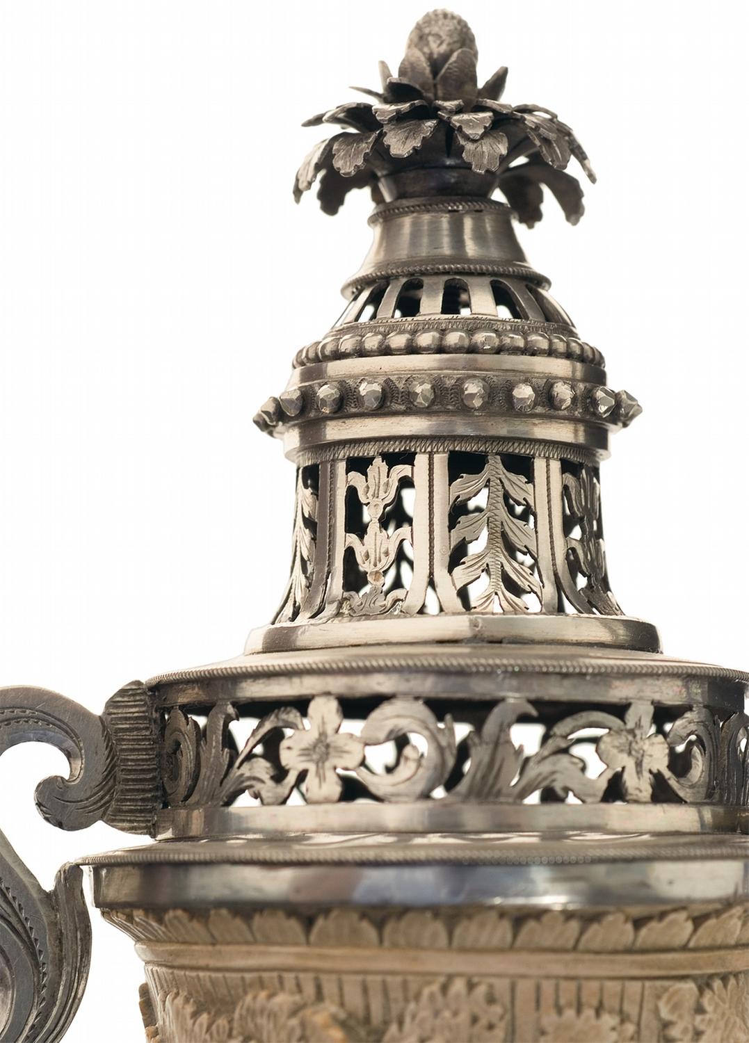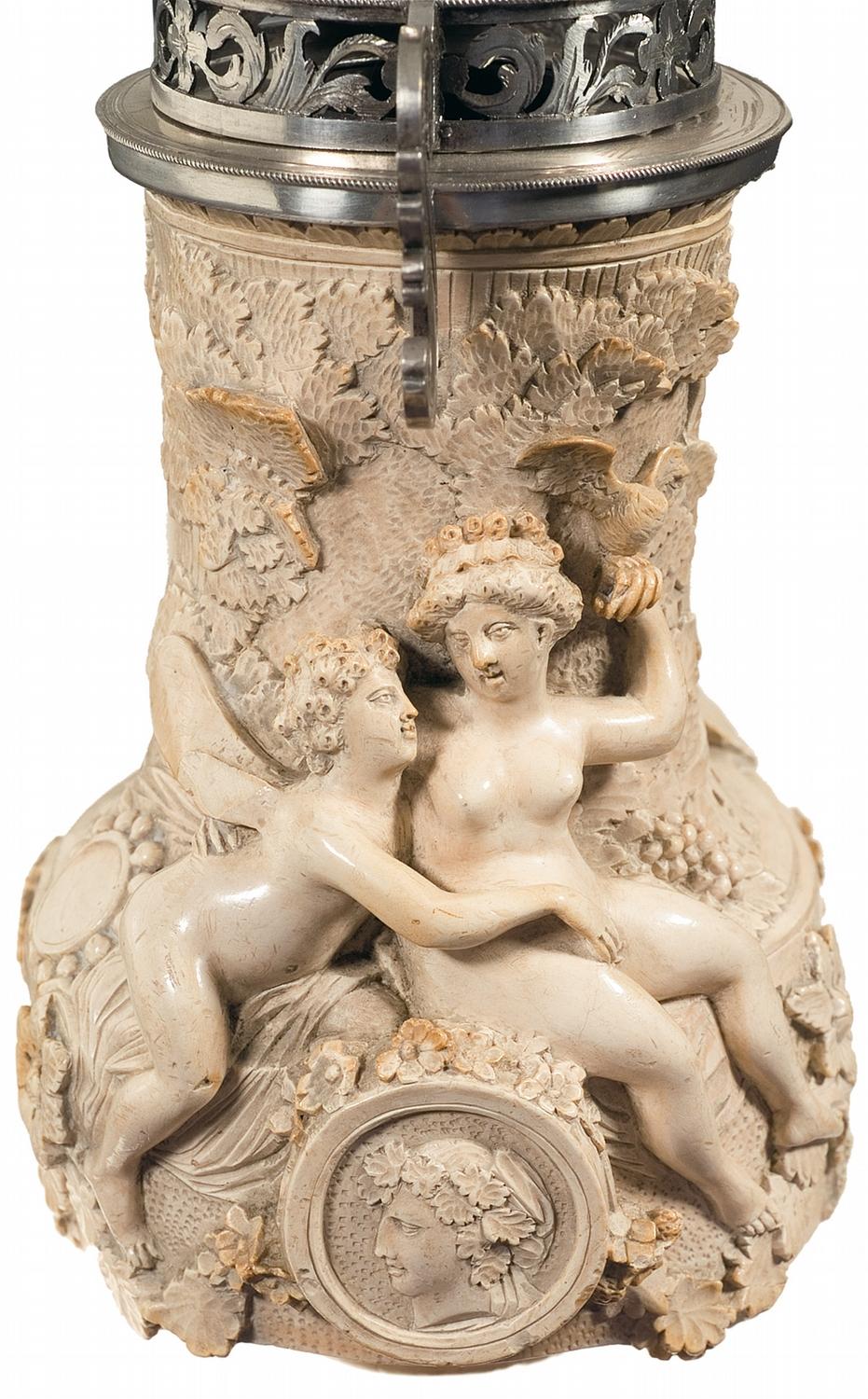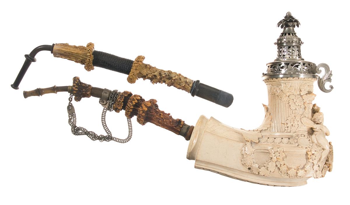 Measuring 6 1/2" long, 5" tall and 3 1/5" wide, with the bowl carved in the form of an partially overgrown pillar, flowers and vines around the base, and large leaves on the back, with the front depicting Cupid and Psyche, god of lust and goddess of the soul, seated above the bust of an unidentified man wearing a laurel. Cupid and Psyche are depicted in a close embrace, with a bird perched on Psyche's outstretched hand and a single leaf as clothing between the two of them. Mounted on top of the bowl is a hinged and vented silver lid, with the handle a pierced-through scroll design, cut through floral work on the main body, and a blooming 3-dimensional flower on top, totaling 3" tall. Included with the pipe are a pair of stems, both of horn and stag construction with short woven tube segments, one fitted with a silver chain and bands, marked "KIESEL".