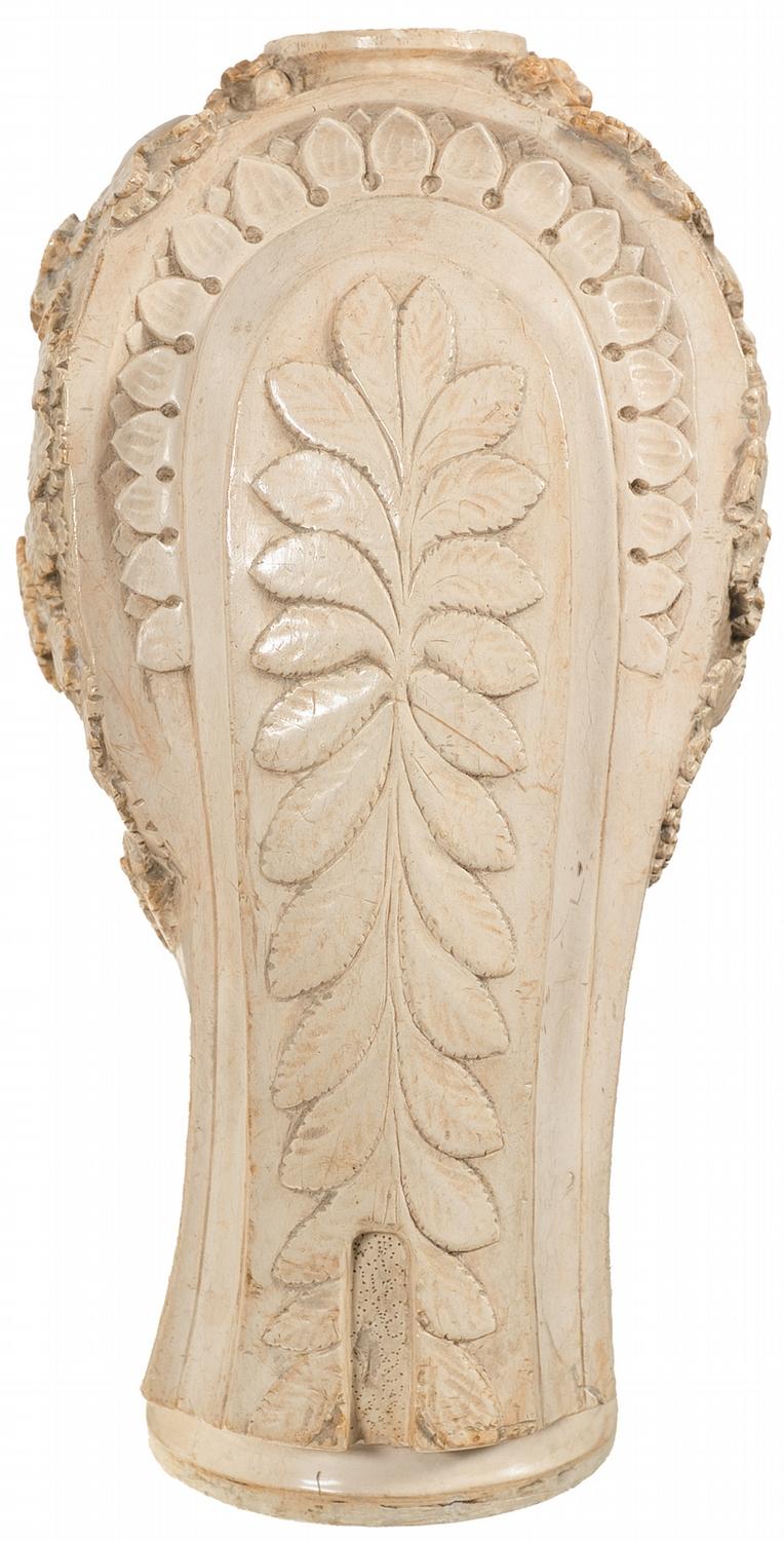 Condition: Very good with most of the pipe intact except for a wing absent from Cupid, along with a few mild handling marks overall. The general color of the pipe is bone white, with hints of a yellow brown color on the high points. Both of the stems are good, with some light chipping and cracks.