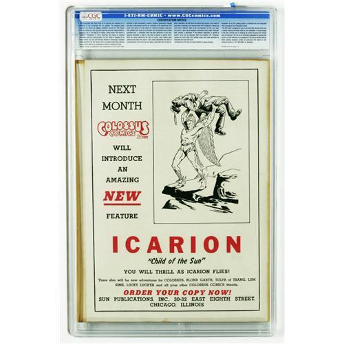 <B>Colossus Comics #1 (Sun Publications, 1940) CGC FN/VF 7.0 Cream to off-white pages.</B></I> We stop at nothing to bring you collectible Golden Age comics, and here's one that's collectible thanks to its obscurity and because it's called "scarce" by both Overstreet and Gerber. A previous Overstreet guide summed up the book thus: "An early esoteric book which ties to the esoteric Green Giant comic." The tie-in to <B>Green Giant</B></I> is that the Colossus character appears in both books, drawn by the same artist, whom CGC identifies as Bernie Wiest (you could win many a comic trivia contest with that bit of knowledge!). This is one of only two comic issues ever published by Sun, the other being another -- dare we say it -- esoteric book, <B>Sun Fun Komiks</B></I>. Overstreet 2006 FN 6.0 value = $1,692; VF 8.0 value = $3,948. CGC census 1/06: 1 in 7.0, 2 higher.