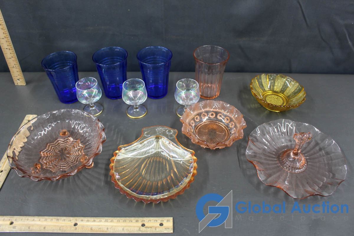 Coloured Glass Dishes - Blue Cups, Irredescent Cups, Pink and Yellow Serving Dishes