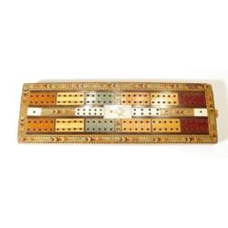 Coloured Masonic Sorrentoware cribbage board, inlaid with ivory, marked 'N. Murray' to back, 32cm in length