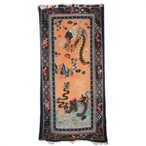 The collection we introduce to you is a exquisite pure wool rug with beautiful dragon pattern handmade in Tibet.Rugs and carpets are basic necessities in the Tibetan daily life.The high quality hand spun,vegetable dyed look,and the primitive but highly stylized patterns greatly appealed to westerners.Typically made for use as mats to sit on or for meditation,door and window covers,horse saddles,bed covers and pillar wrapping,the traditional Tibetan weaving generally reflect traditional Tibetan culture and religion.However,Chinese designs were also dominant as seen in the display of dragons,phoenix,clouds, floral and lotus images.