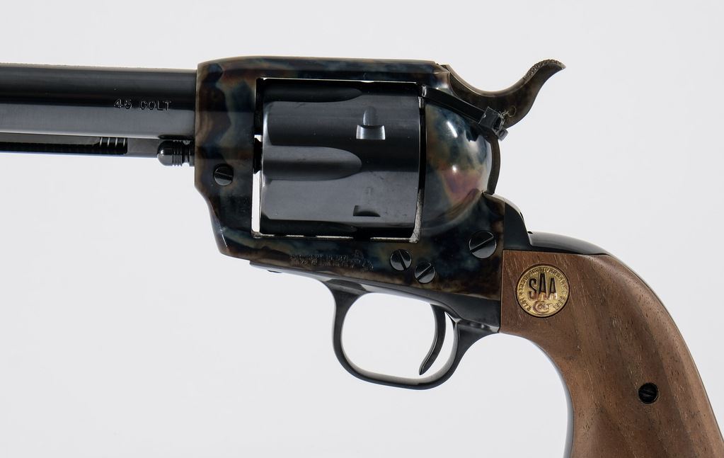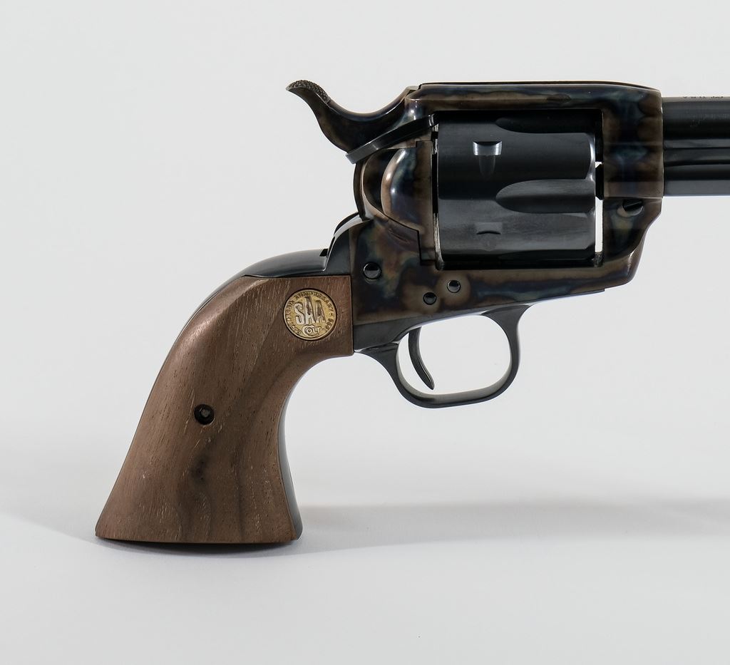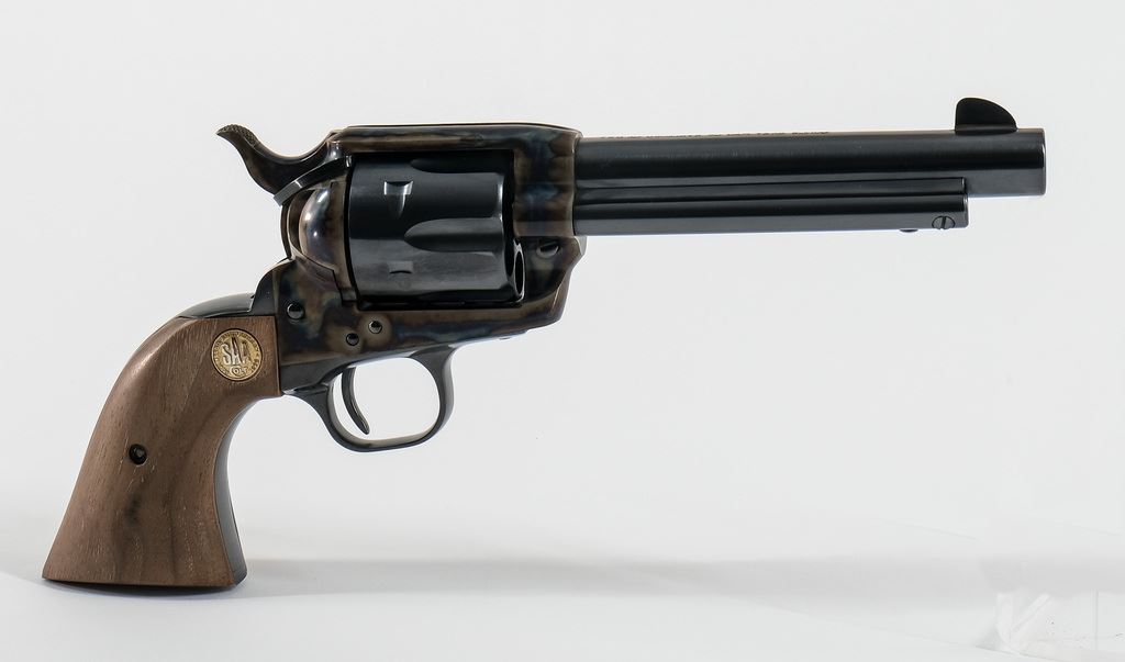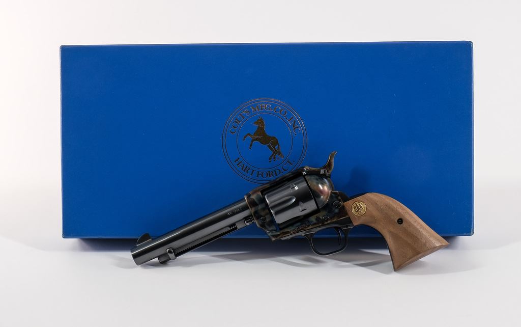 Limited run of 1,000 guns made between 1997 - 2002, these custom shop guns specifically commemorate the original Colt Single Action Army patented around and made in 1873. Fire blued finish and color case hardening is brilliant and awe inspiring... a true tribute to the SAA! This one is chambered in .45 colt, 5.5" barrel. Walnut grips and embellished with a special gold medallion. Condition: 99% with papers/tags. Hard to find a blemish, we only observed one ultra fine scratch just above extractor. Zip tie still around cylinder/hammer (no turn line). Includes original serialized outer carton and blue box.