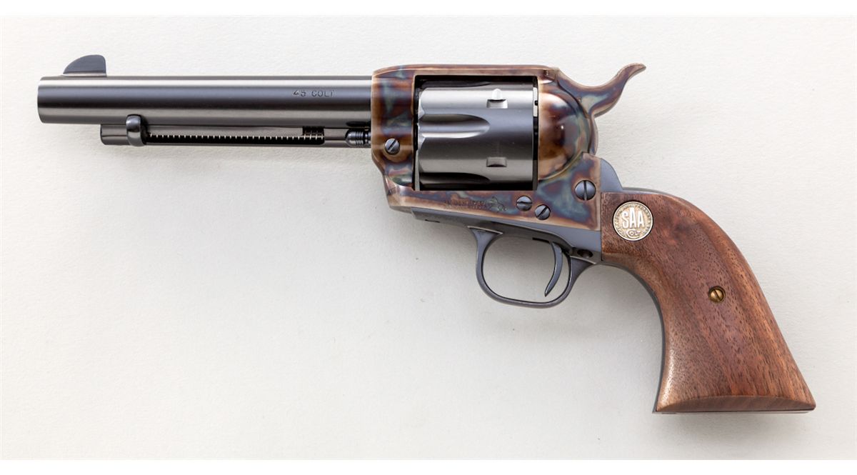Colt 125th Anniversary Single Action Army Revolver (P1850AE), #SA74121, .45 Colt cal., 5-1/2'' barrel, carbona blue and rich case hardened frame, two-piece walnut grips with 125th anniversary medallions, 1873-1898. Revolver features fully case-hardened hammer, beveled front cylinder edge, with all fit and finish accomplished to a very high degree. In Colt blue box with instructions, cable lock, and white slip case. Condition is excellent, appearing new and unfired. Est.: $1,000-$1,500. (Consecutive to above lot.) (Modern)