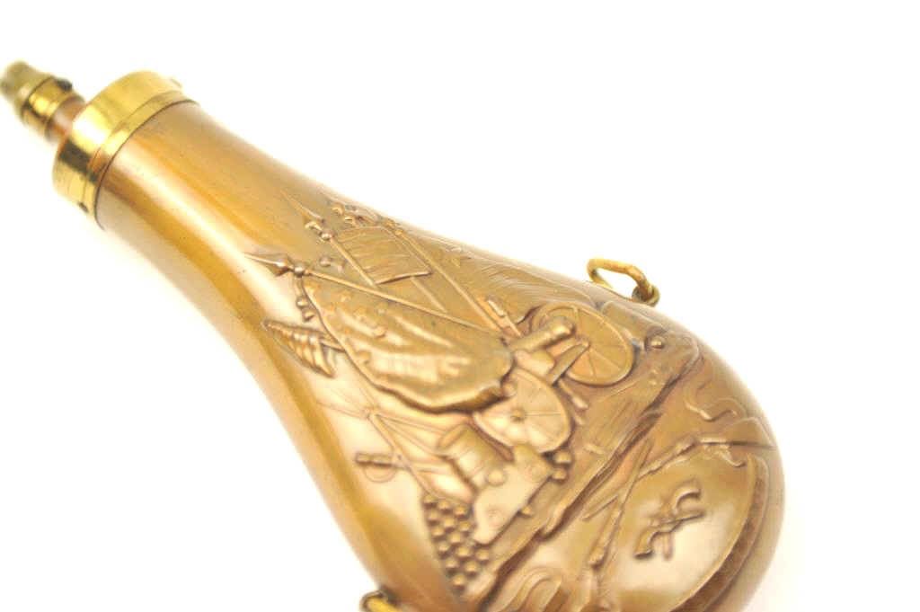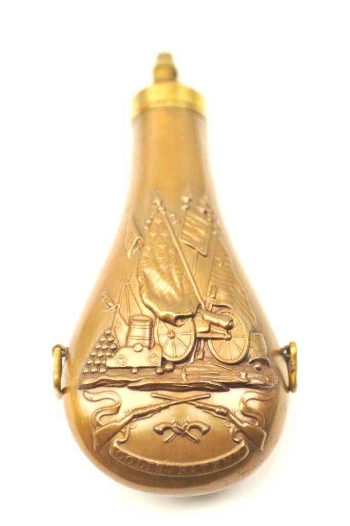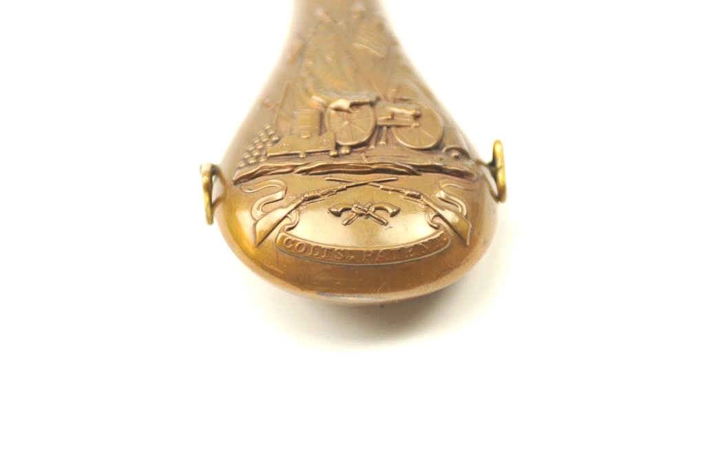 Colt 16oz flask intended for use with Paterson carbine showing Texas flag, American flag, and liberty cap along with defined cannon, mortar and drum along with crossed Paterson revolvers with flared grips.Believed by collectors to be supplied with 1839 Texas contract carbines but possibly used with dragoons also. This exact flask is pictured in Colt accoutrements by Robin Rapely Ill. #F-17 former Perry Hansencollection. The condition is fine to excellent retaining mostly all of its original lacquer showing minimal aging and light imperfections. 9.5-9.8 on a scale of 1-10 and we know of only 1 other in thisstunning original condition. Est.: $6,000-$12,000