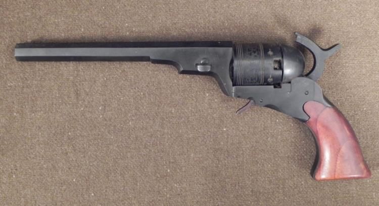 This is a reproduction of the Colt Paterson Revolver, originally patented in 1836. The cylinder has etched images of stagecoach battles. The barrel is octagonal, and has imprinted numbers and hallmarks on the underside. The grip is wood. Its overall length is 12". It is in excellent condition, and the mechanism works fine. * The Paterson was the first commercial repeating firearm to use a revolving cylinder with multiple chambers and a single barrel. This is great reproduction of the original model.