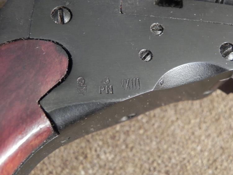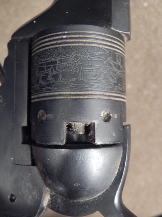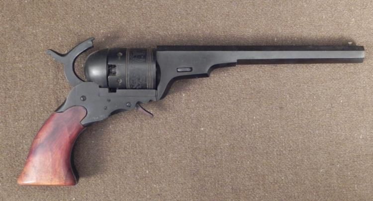 This is a reproduction of the Colt Paterson Revolver, originally patented in 1836. The cylinder has etched images of stagecoach battles. The barrel is octagonal, and has imprinted numbers and hallmarks on the underside. The grip is wood. Its overall leng