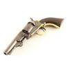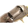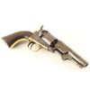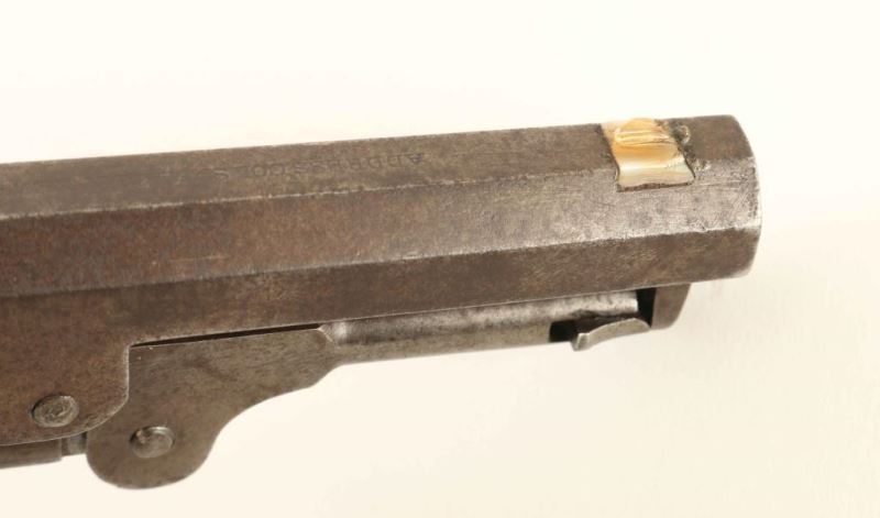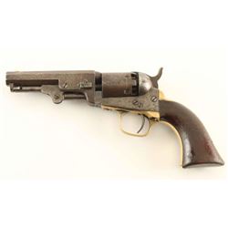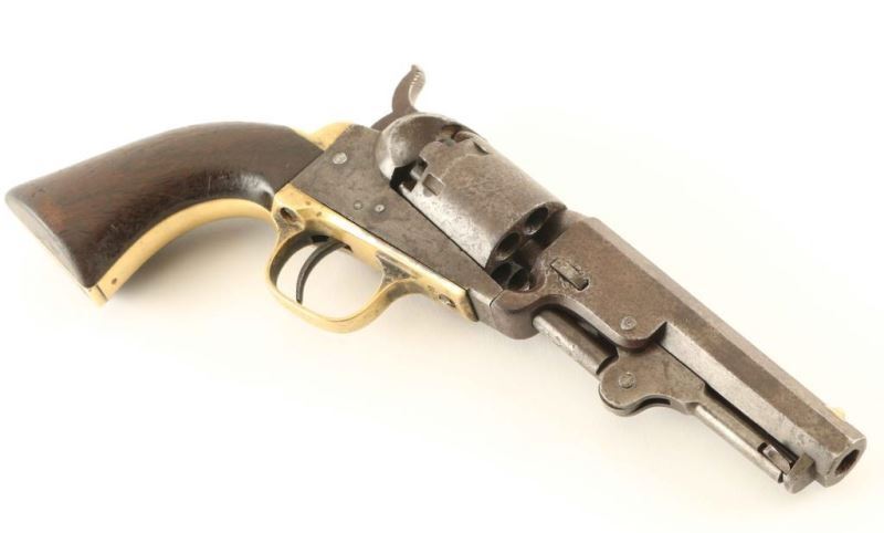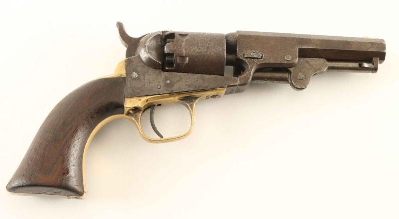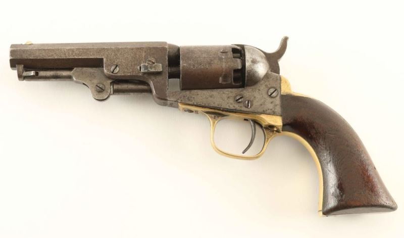 Antique single action six-shot percussion revolver cambered for .31 caliber ammunition, circa 1863. Features a blued 4" octagon barrel with "ADDRESS COL SAML COLT NEW-YORK U.S. AMERICA" single line address, dovetailed mother-of pearl blade front sight, 'v' notched rear sight on the hammer, non-fluted cylinder with roll stamped stagecoach holdup scene, case hardened loading lever, smooth trigger, knurled hammer spur, brass grip frame and one-piece walnut grip. Markings are very good, cylinder scene is approximately 45% intact and all serial numbers are matching with the loading loader & barrel wedge which are both unmarked. Revolver shows a couple traces of it's original finish with the balance of the metal surfaces turned to an aged brown patina. Action performs well. nipples are good, bore is good+, and the wood grip is very good. Condition is NRA good to very good. ***Antique Firearm***