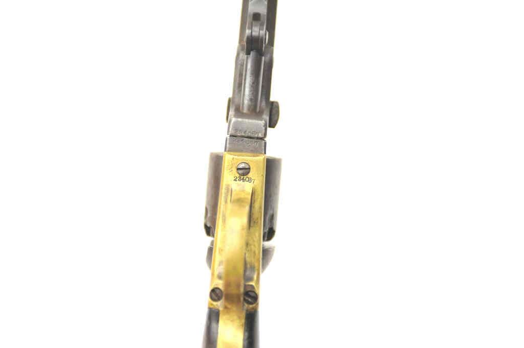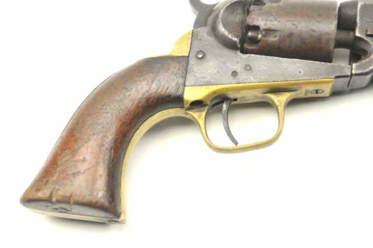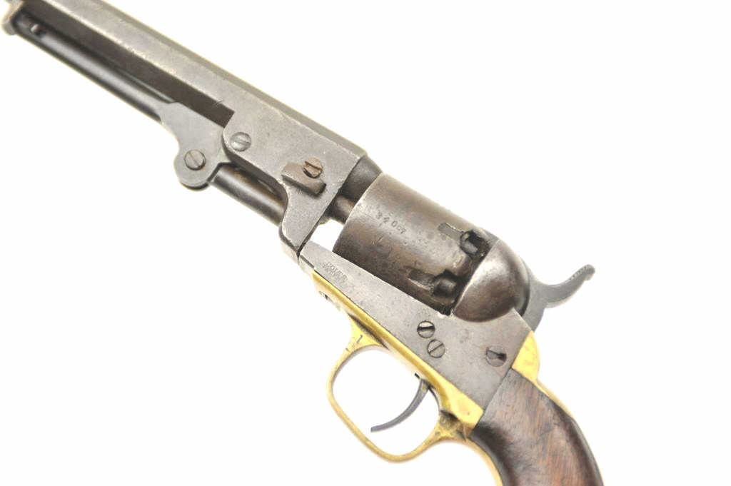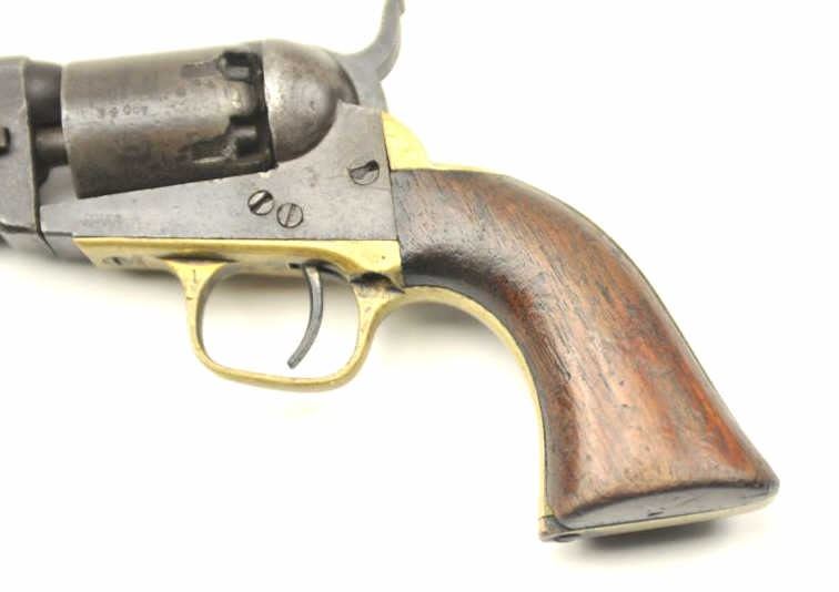 Colt 1849 Pocket Model .31 caliber percussion with 1 line New York Address, 6 shot cylinder, and 5” barrel, S/N 234067. Fair to good condition with gray/brown patina finish. All matching visible numbers. Traces ofcylinder scene. Good markings. Scattered minor pitting and erosion. The grips show traces of varnish with small losses, tacking marks on bottom right grip and 2 cut “battle notches” on bottom right grip. Nipplereplaced and some battering and metal loss around nipples at back of the cylinder. Small gap at the rear of frame. The action is working. An honest well used ’49 with scarce 5” New York six shot configuration. (Antique) Est.: $350-$700