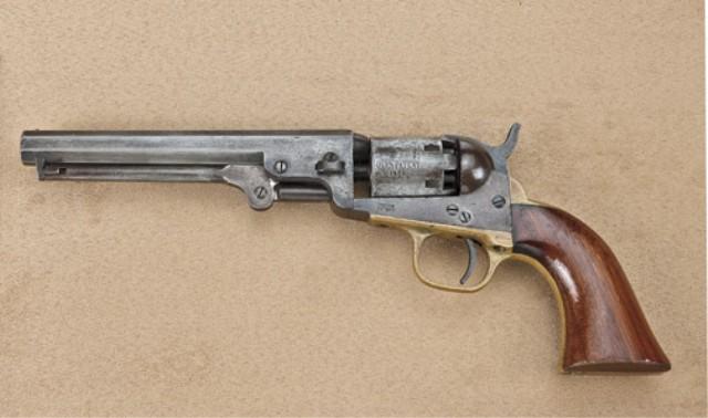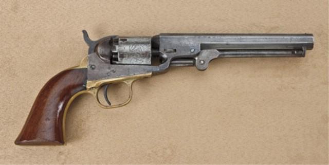 Colt 1849 Pocket Model Revolver, .31 caliber percussion, 6” barrel, patina finish, varnish wood grips, one-line New York address, 6-shot cylinder, serial #262932. The revolver remains in good to very good original condition showing a grey to brown patina finish overall with some faint traces of original finish mixed in, scattered light to moderate erosion and surface pitting. Cylinder shows 40-60% original scene with a light cleaning long ago. The varnish wood grips are very good plus with 70-80% varnish, some minor marks, slight imperfections, wear at the edges. All matching visible serial numbers. Tight action, good interior. Est: $700 - $1,400