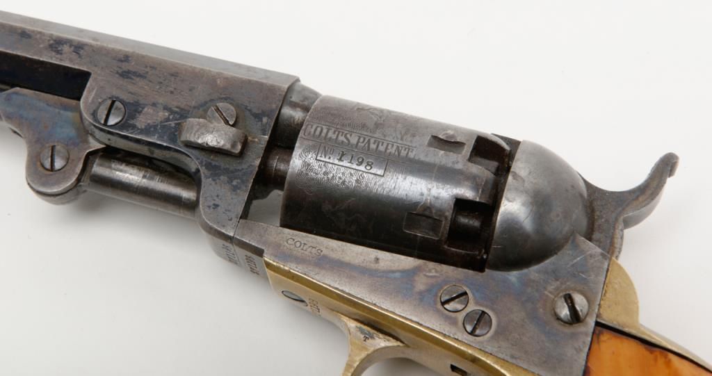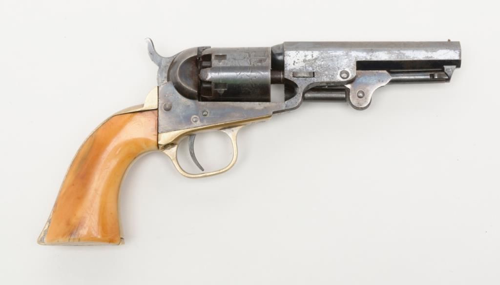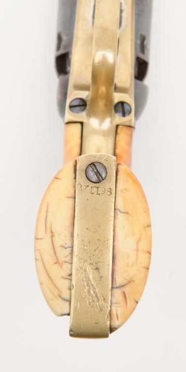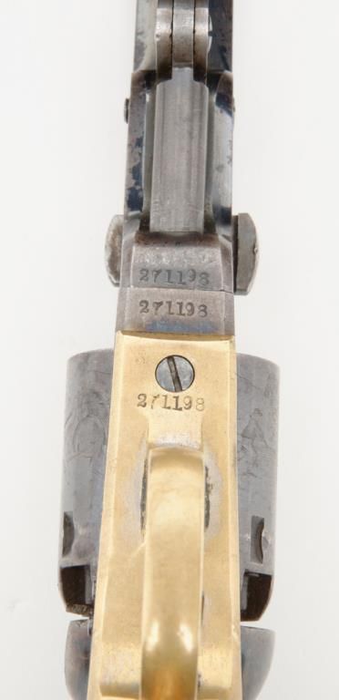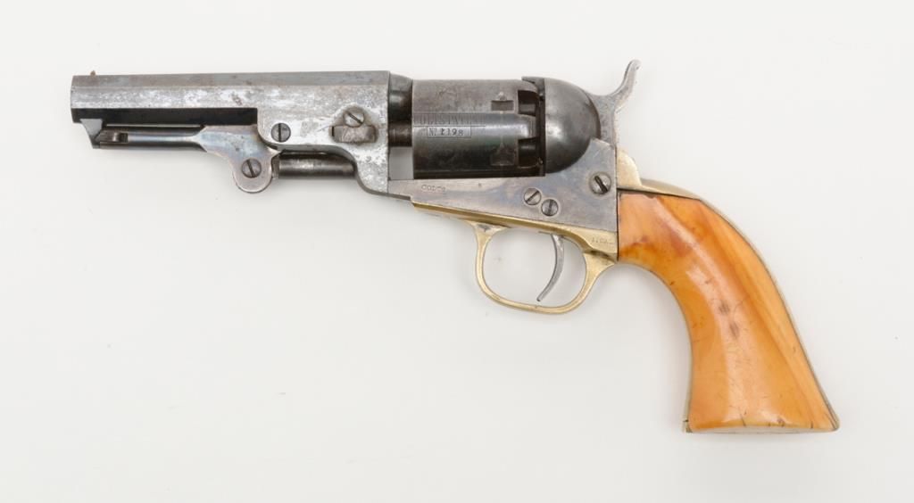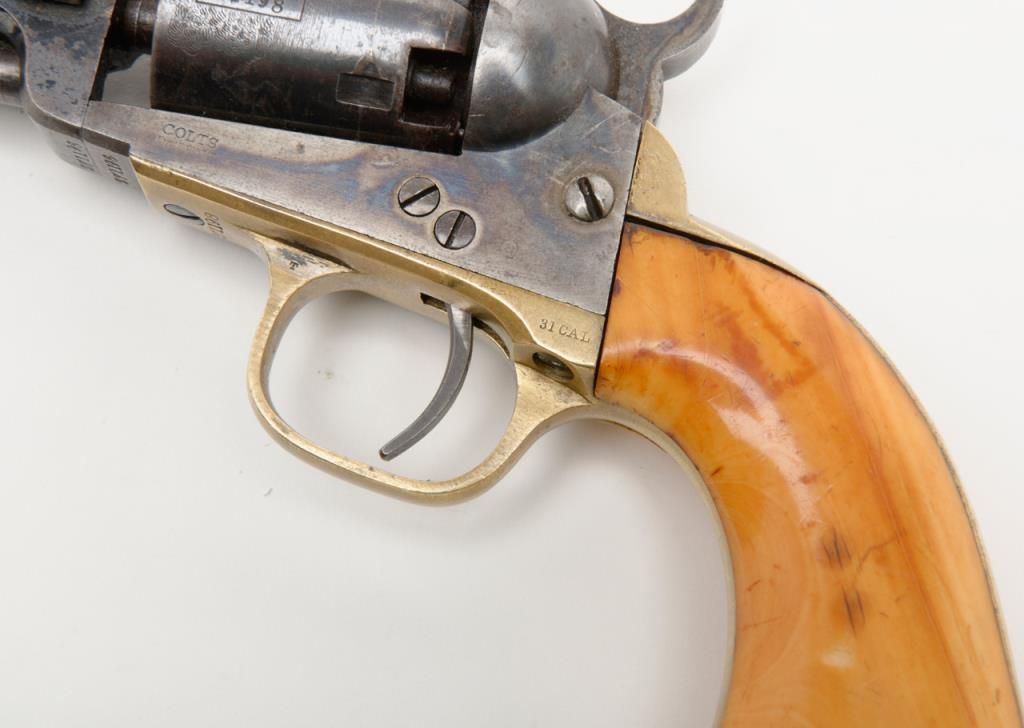 Colt 1849 Pocket Model in .31 caliber percussion with 4” barrel remaining in near fine original condition, serial number 271198. This Colt shows a one line New York barrel address with a 6 shot cylinder. Approximately 20% to 40% original bright blue remains on the barrel which is flaking and drifted areas where the finish is lost have gone to a nice light patina. The cylinder shows 70% to 80% original bright blue with a like amount of cylinder scene that is just slightly light. Theframe, loading lever and hammer show 75% to 85% bright and colorful case hardening. The straps show just a trace of silver. The revolver shows original to the period old ivory grips with some small losses at the back heel and some normalaging, cracking and deep patina. All visible serial numbers are matching. The edges are super crisp and there are just some small marks around the edge of the wedge and on the right side of the barrel. A very attractive pocket model Coltwith a lot of strong original finish. Est.: $3,000-$6,000