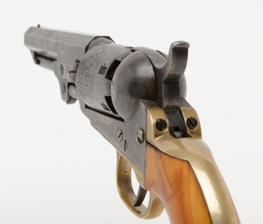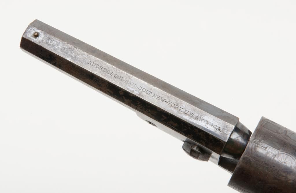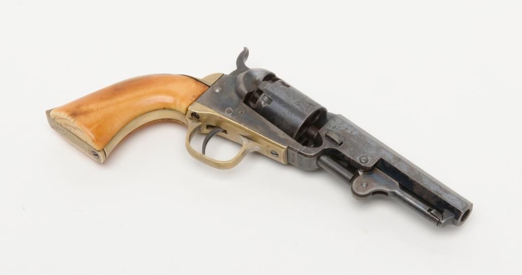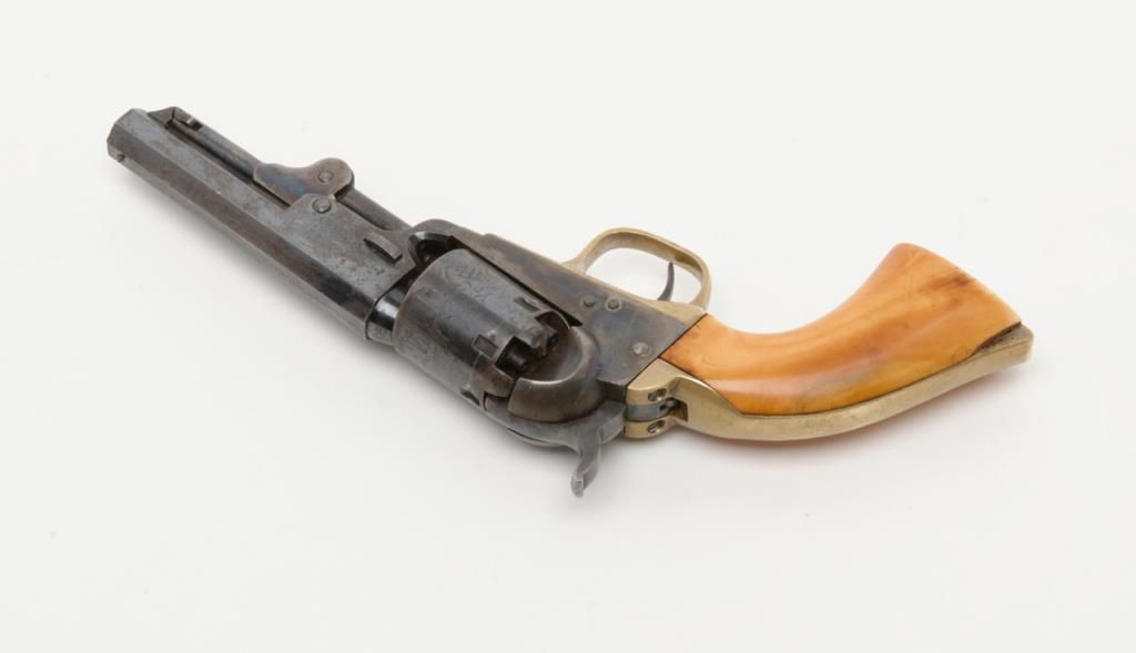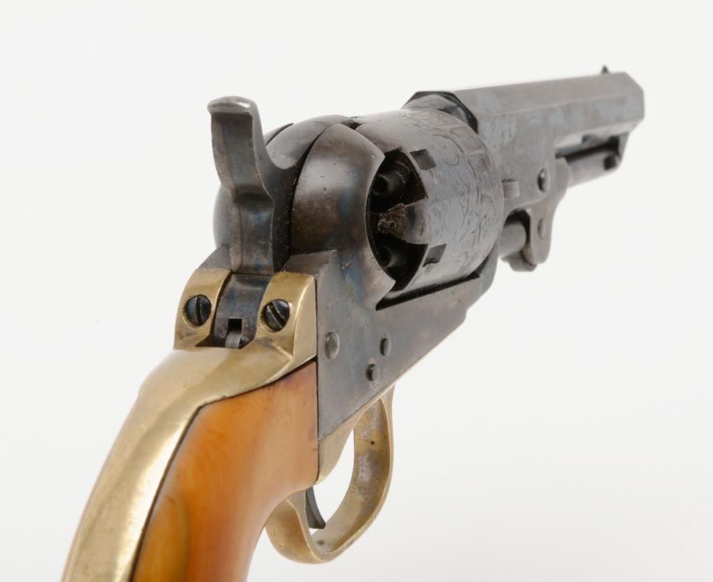 Colt 1849 Pocket Model in .31 caliber percussion with 4” barrel remaining in near fine original condition, serial number 271198. This Colt shows a one line New York barrel address with a 6 shot cylinder. Approximately 20% to 40% original bright blue remains on the barrel which is flaking and drifted areas where the finish is lost have gone to a nice light patina. The cylinder shows 70% to 80% original bright blue with a like amount of cylinder scene that is just slightly light. Theframe, loading lever and hammer show 75% to 85% bright and colorful case hardening. The straps show just a trace of silver. The revolver shows original to the period old ivory grips with some small losses at the back heel and some normalaging, cracking and deep patina. All visible serial numbers are matching. The edges are super crisp and there are just some small marks around the edge of the wedge and on the right side of the barrel. A very attractive pocket model Coltwith a lot of strong original finish. Est.: $3,000-$6,000