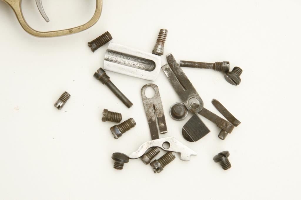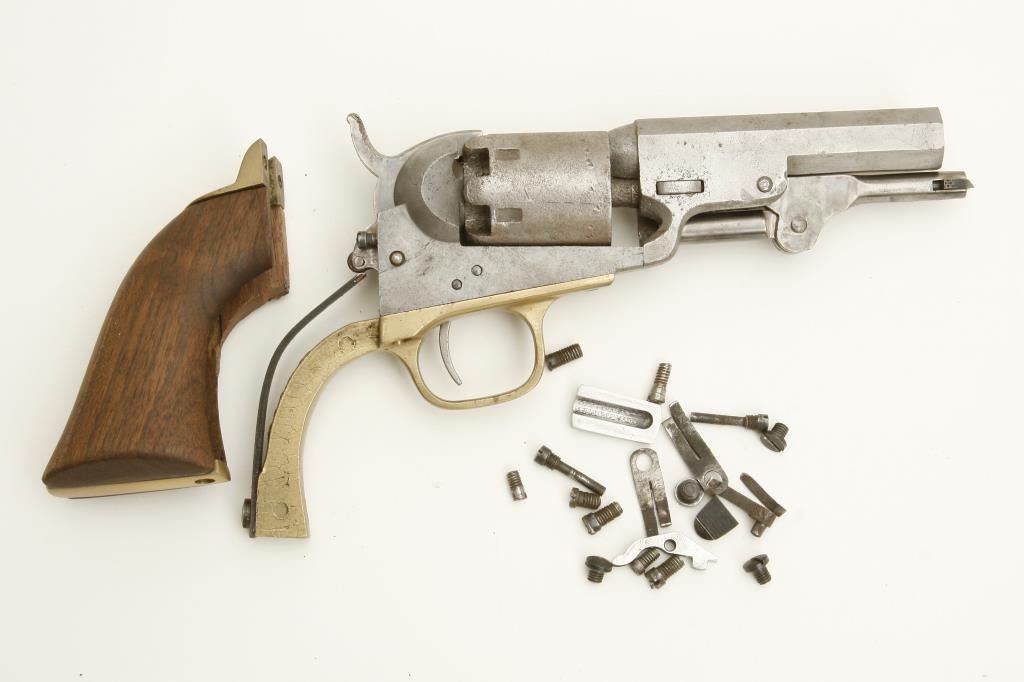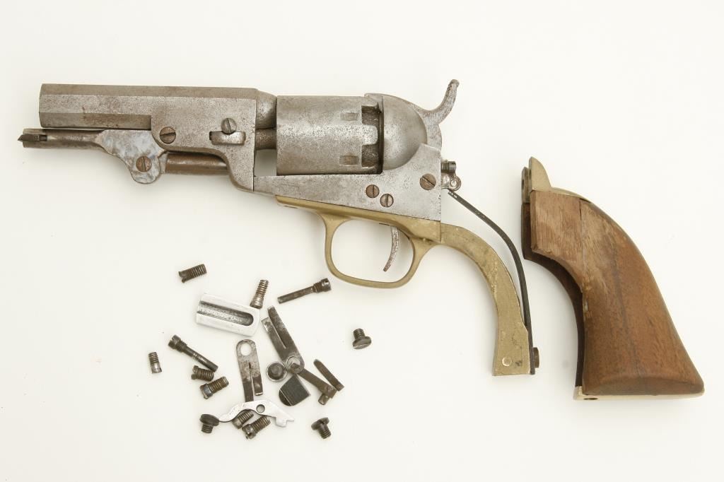 #230376. The pistol is missing the original trigger guard and back strap with a reproduction trigger guard added. The barrel address is light and almost entirely legible. The barrel has been shortened to 3 ¼”. The serial numbers on the barrel assembly, frame and cylinder all match. The action does not function and all nipples are missing. The lot includes a miscellaneous bag of 1849 Colt parts. (Antique) Est.: $100-$200.