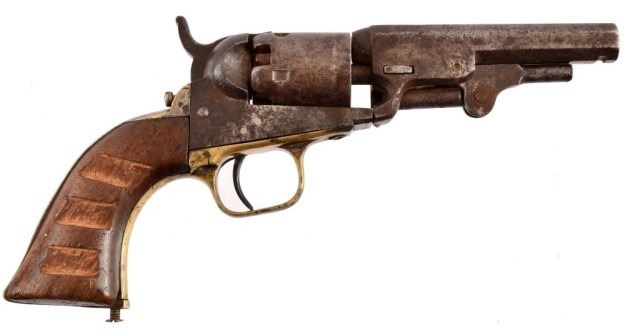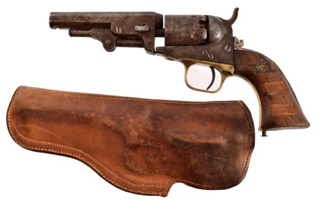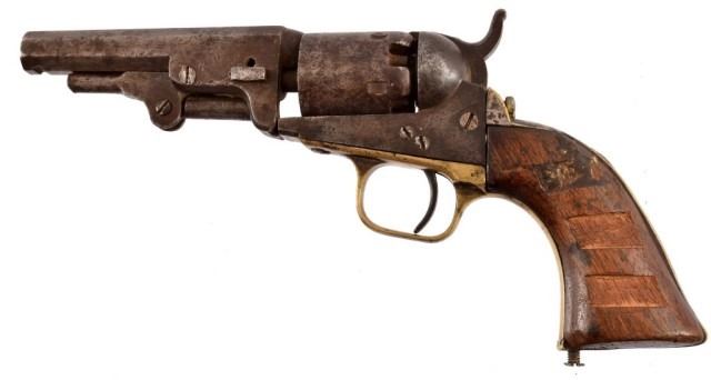Colt Model 1840 Pocket Navy .36 cal. 4" octagon barrel, with contemporary leather holster. Some condition issues and replacement parts.