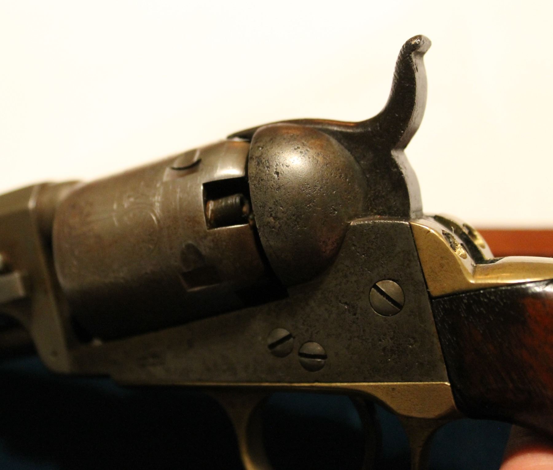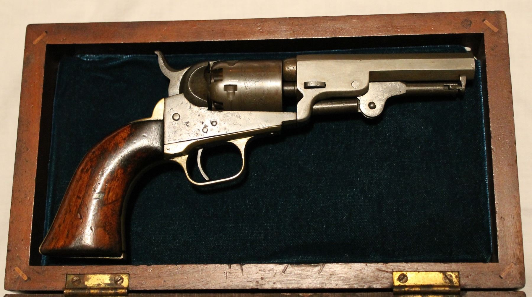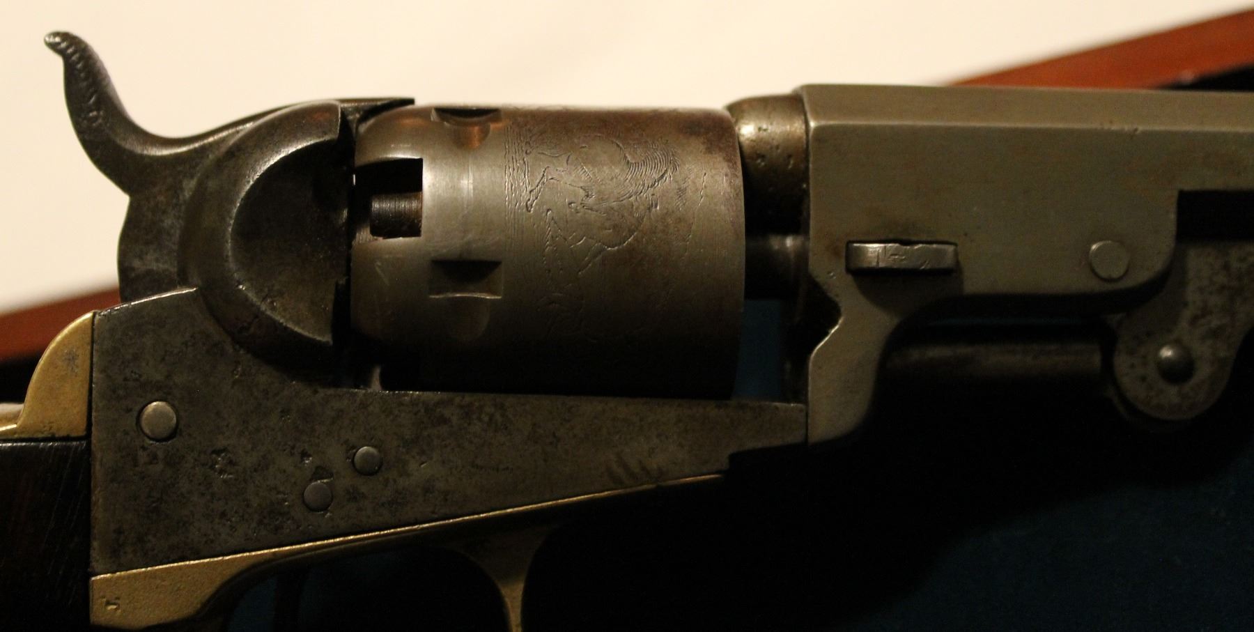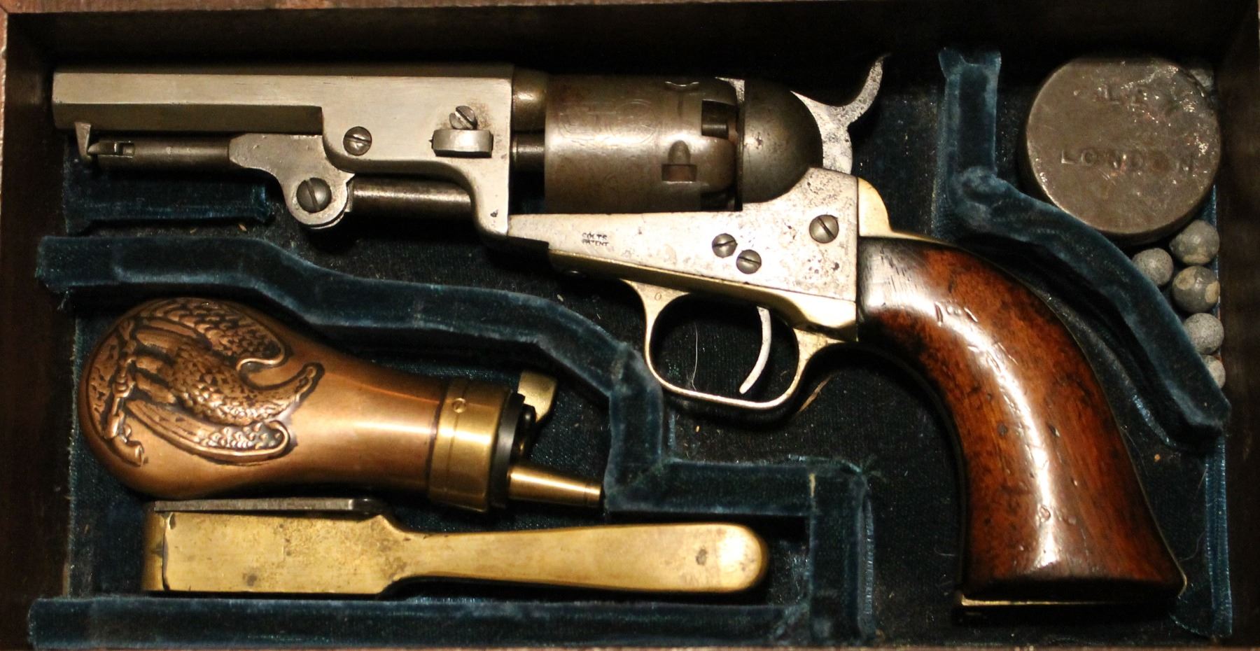 Colt 1849 Pocket Pistol, .31 cal, cased, powder flask, bullet mold, engraved stagecoach scene on cyl