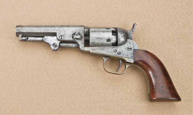 Colt 1849 pocket model, .31 caliber percussion, 4” barrel, traces of blue and case hardened finish, varnish wood grips, serial #106445. The revolver shows two-line New York address, 5-shot cylinder, small triggerguard. The metal surfaces shows a lightly cleaned grey patina finish, some traces of blue and case hardening drifting to a light grey patina, scattered light erosion and pinprick pitting. Good edges, good markings. Approx. 60-75% original cylinder scene. The varnish wood grips are very good plus with 75-85% varnish, some slight wear at bottoms and edges, some minor nicks and mars. The backstrap and triggerguard show 80-90% original darkened silver plate. The loading lever and plunger show some pitting at the edges and front. All matching visible serial numbers. Good action, good interior. Est: $700 - $1,400