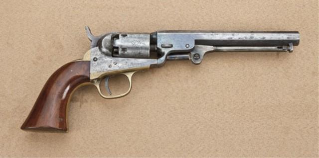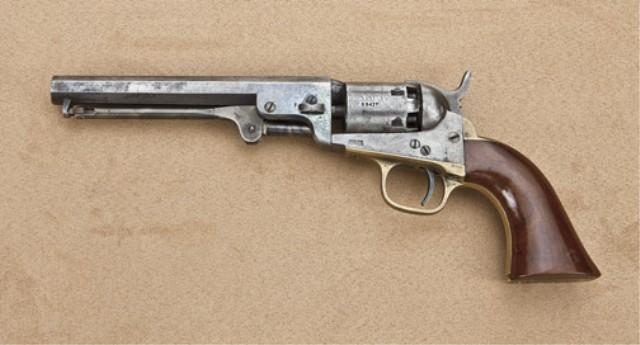Colt 1849 pocket model, .31 caliber percussion, 6” barrel, blue and case hardened finish, varnish wood grips, serial #258417. The barrel shows 20-30% original blue, the ramrod and catch are replacements. The cylinder shows 30-50% original scene, some light cleaning. The frame shows traces of case hardening within a browning patina. The varnish wood grips are very good plus with 75% varnish, a few dings, mars, scratches. The markings are sharp, the edges fairly crisp, the action good. There are some dings, mars on the cylinder, and some areas of pitting. All matching visible serial numbers, some screws are replaced. From the Bernard Braverman Estate. Est: $500 - $900