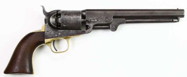 6 shot revolver in good original condition, all matching serial numbers, Mfg'd 1861. Barrel, frame and receiver all show uncleaned gray drifting brown patina, light scattered pin prick pitting, sharp barrel address, brass front sight intact, cylinder with faint scene remaining. Original walnut grips remains, small lose at toes otherwise very good, nice fit to metal. Overall good mechanically tight 51 with excellent action, good bore, Mfg'd during first year of American Civil War. Antique. Est. 1200-1800