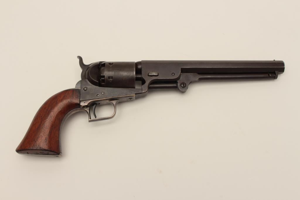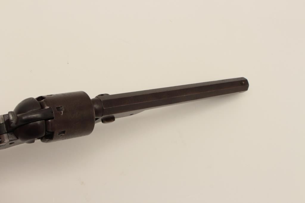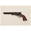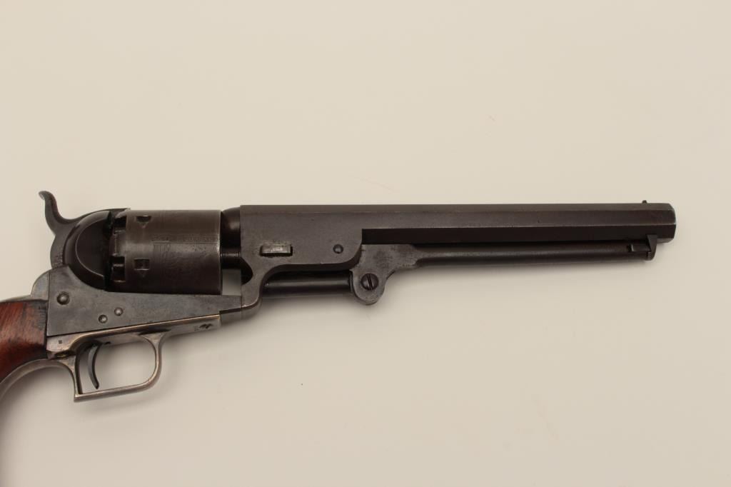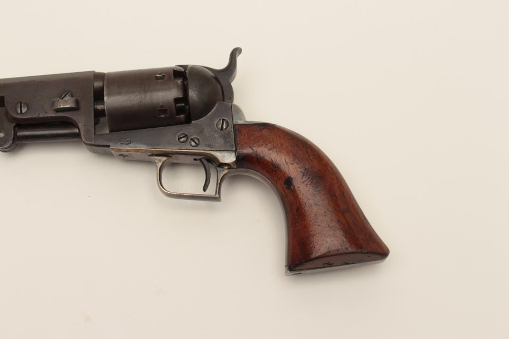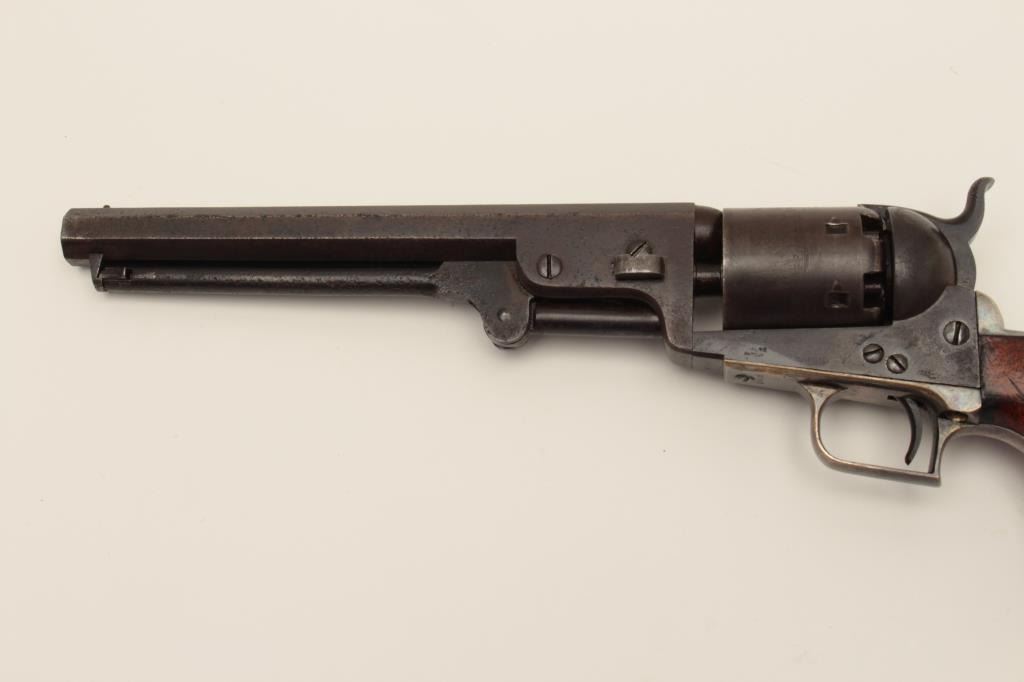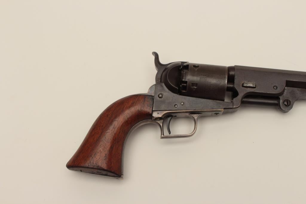 Colt 1851 Navy 2nd model squareback revolver, S/N 1453 in early production range and made in the California gold rush era. This revolver remains in good to very good original as found condition with traces offinish mixed in a brown patina. Scattered light to moderate pitting mostly on the barrel probably from holstering. The frame is crisp as is the cylinder with 70%-80% original scene remaining and good Ornsbysignature. Good barrel address and mostly visible very small Colt’s patent on the frame. The grips show 40%-60% varnish and are at least very good plus but not quite fine showing minor wear and aging. 90% plus thickold original sliver plate that is darkened. Some “tapping” marks on the bottom of the grips and strap. All matching visible serial numbers. An absolutely original and early 2nd model with the appearance collectors likeand above average for this variation. (Antique) Est.: $5,000-$10,000