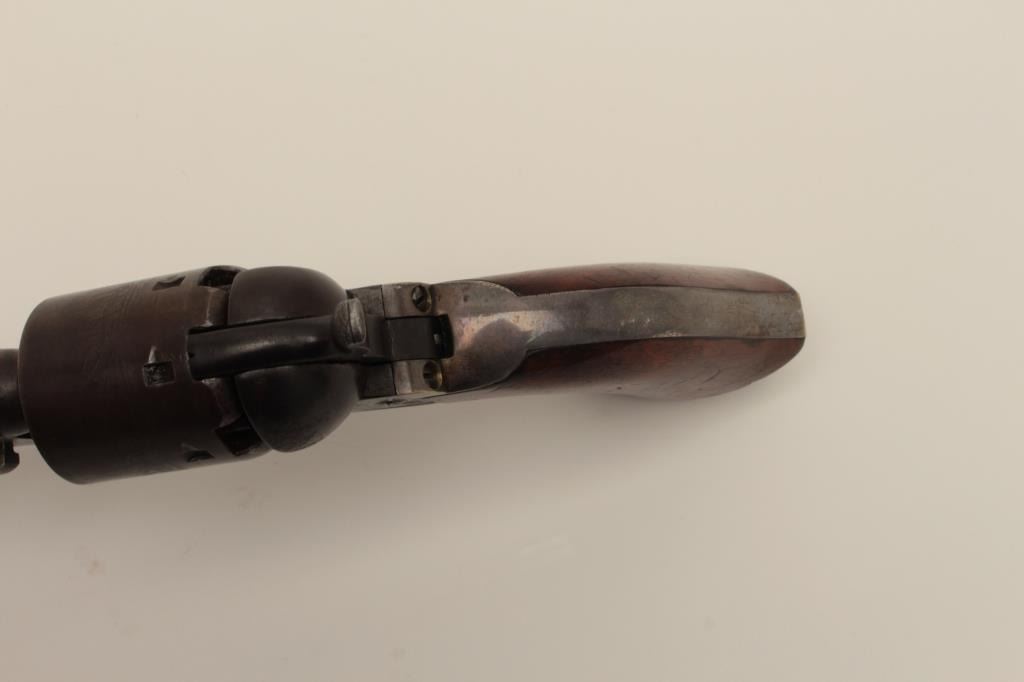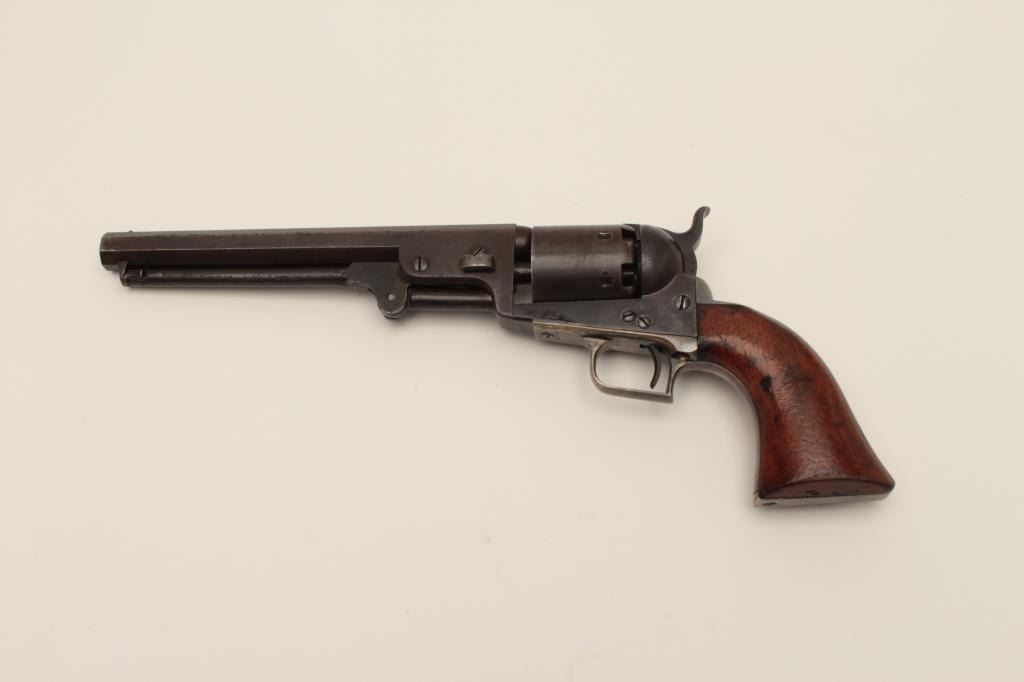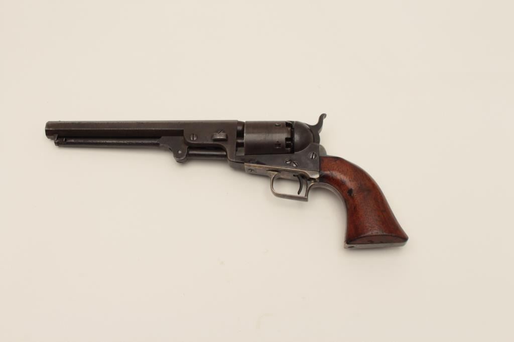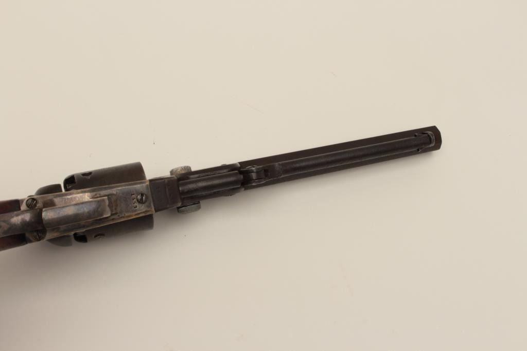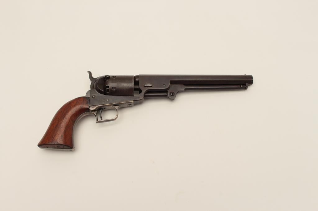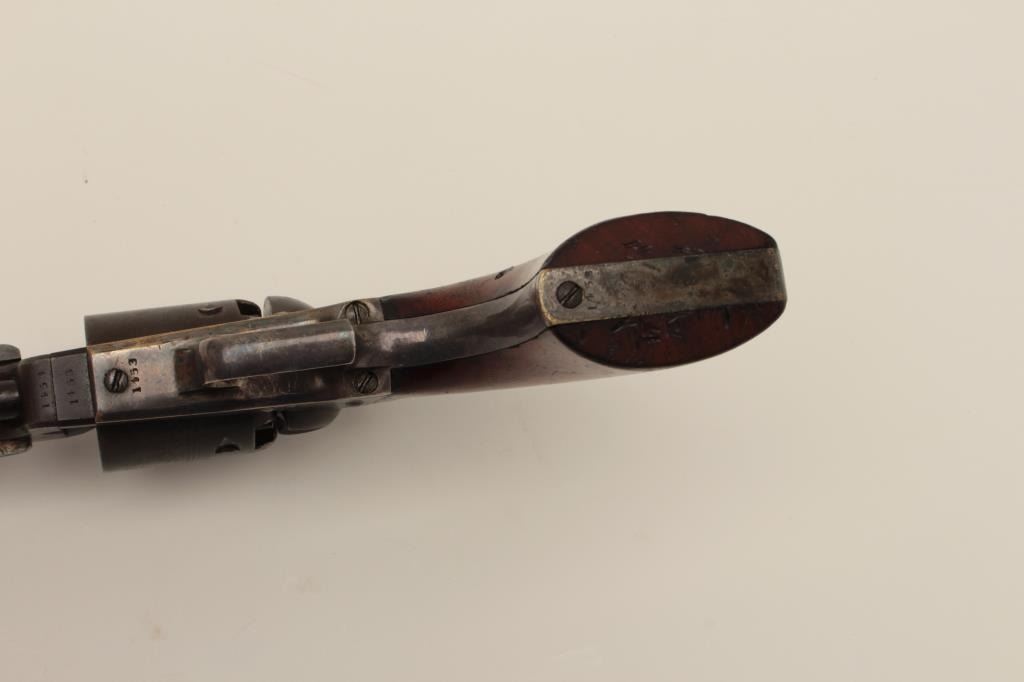 Colt 1851 Navy 2nd model squareback revolver, S/N 1453 in early production range and made in the California gold rush era. This revolver remains in good to very good original as found condition with traces offinish mixed in a brown patina. Scattered light to moderate pitting mostly on the barrel probably from holstering. The frame is crisp as is the cylinder with 70%-80% original scene remaining and good Ornsbysignature. Good barrel address and mostly visible very small Colt’s patent on the frame. The grips show 40%-60% varnish and are at least very good plus but not quite fine showing minor wear and aging. 90% plus thickold original sliver plate that is darkened. Some “tapping” marks on the bottom of the grips and strap. All matching visible serial numbers. An absolutely original and early 2nd model with the appearance collectors likeand above average for this variation. (Antique) Est.: $5,000-$10,000