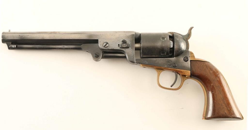 American Civil War era single action percussion revolver chambered for .36 caliber ammunition, manufactured circa 1863. Features a blued refinish, 7.5" octagon barrel marked "-ADDRESS COL SAML COLT NEW-YORK U.S. AMERICA", post front sight, 'u' notch rear sight cut into the hammer lip, smooth thin trigger, knurled hammer spur, non-fluted six shot cylinder, loading lever, brass grip frame and one-piece varnished walnut grip. Matching serial numbers on the barrel lug, frame, trigger guard, & backstrap, with #67558 on the barrel wedge and #7698 on the cylinder. The hammer, cylinder pin & trigger are newer replacements. Revolver exhibits scattered pin prick pitting on the original parts with approximately 50% bluing intact. Cocking the hammer does not consistently rotate the cylinder but the action otherwise functions properly, the bore is very good, markings are faint on the barrel, the cylinder scene is no longer visible and the wood is good as shrunken with four notches in the right side. Condition is NRA Good. ***Antique Firearm***