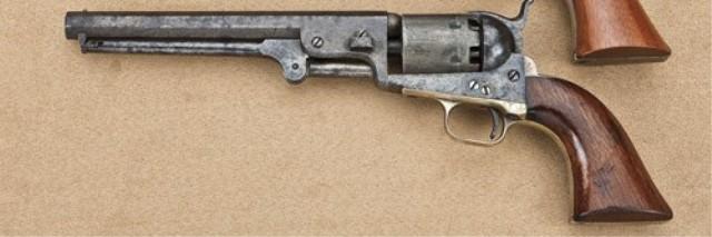 Colt 1851 Navy .36 caliber percussion revolver, small guard variation, serial #11949. The pistol remains in fair to good original condition showing a grayish to brown patina finish, some scattered light to moderate scattered erosion and pinprick pitting and a couple of small areas of slightly heavier pitting. The cylinder shows some cleaning, slight traces of scene, some bumps and mars, and old replaced nipples and safeties. The barrel address is good, the small Colt’s patent is mostly visible. The straps show 50-60% silver. The backstrap is marked with small hand stamp “CMD”. The varnish wood grips are good to very good with 75% varnish, some mars, one or two gouges. At least good overall. All matching visible serial numbers. Some mars around the trigger screw area on left side of frame and one or two replaced screws. An early gold-rush era 51 navy. From the Bernard Braverman Estate. Est: $1,250 - $2,500