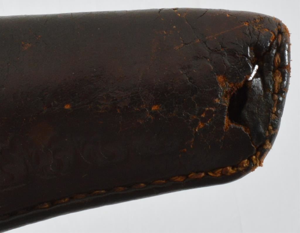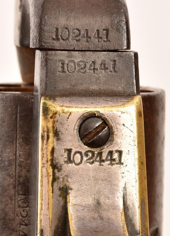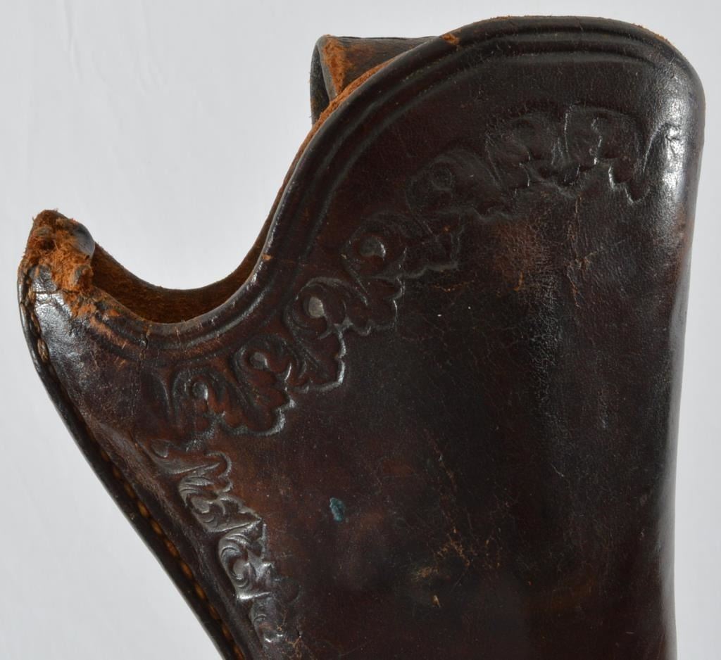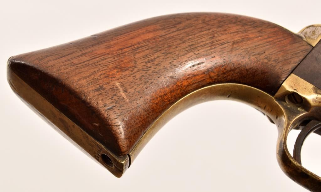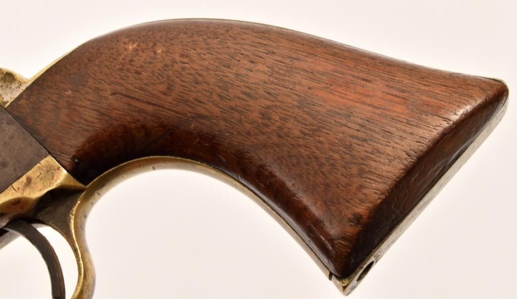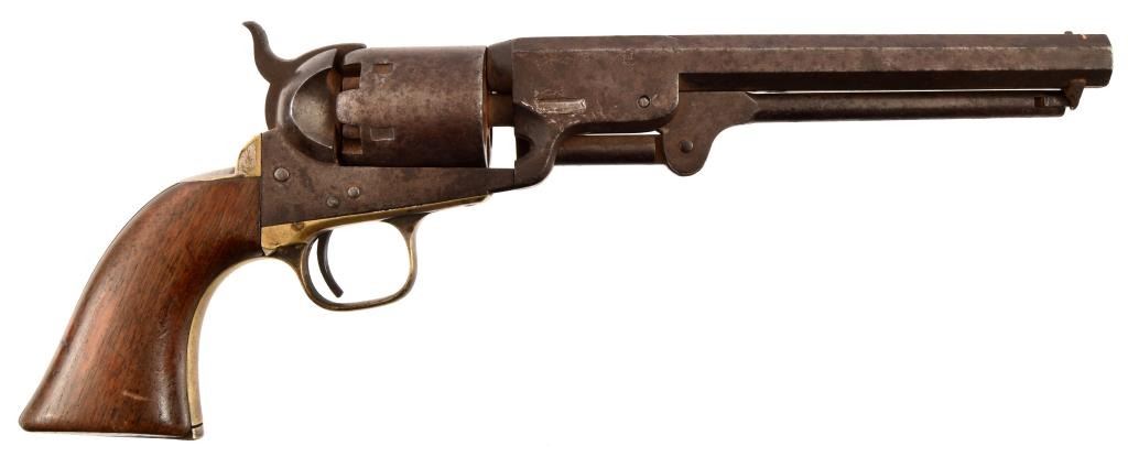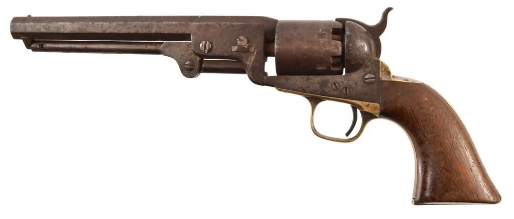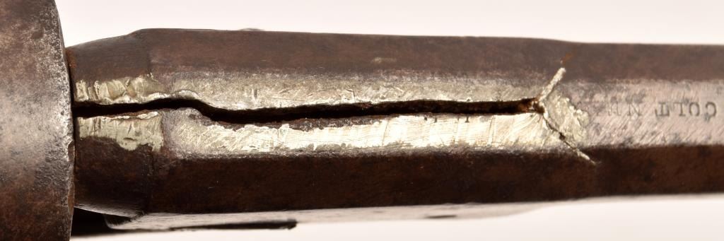 Colt 1851 Navy .36 SN 102441, with 7.5" barrel with 2" crack along top. Obvious grind marks on wedge and along barrel crack. Missing backstrap butt screw. Antique. Pre 1900 Slim Jim Holster For 7-1/2" SAA.