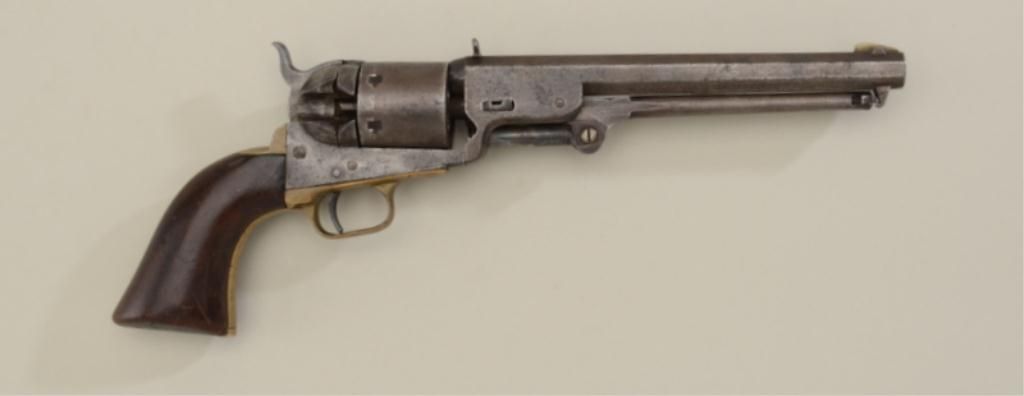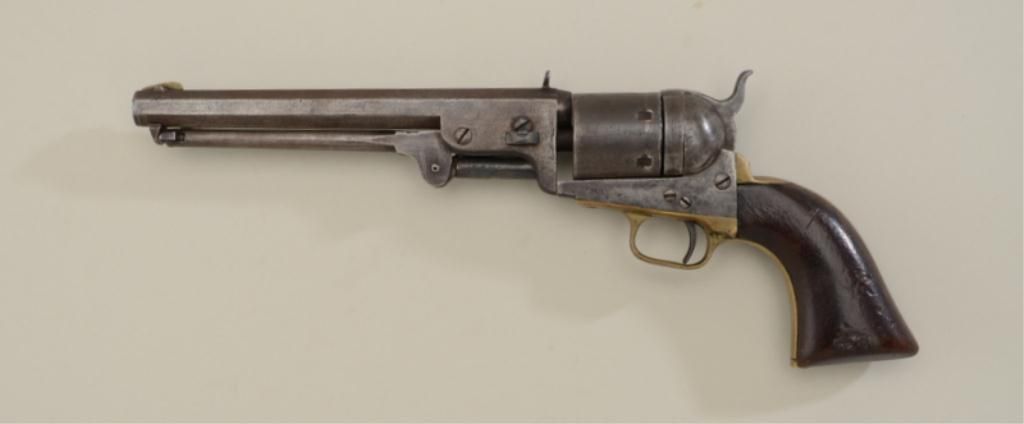 Colt 1851 Navy Revolver converted to 38 rimfire cal. Early small guard variation. Serial # 22199, the pistol has been fitted with a large buckhorn rear sight and blade front sight during its period of use. Theconversion is a Richards-Mason style that’s somewhat crude probably by frontier gunsmith. Even brown patina finish, good overall, matching numbers, a few replaced screws and small parts missing 1 triggered guard screw. Action working, numbers match including wedge. Est.; $750-$1,500.