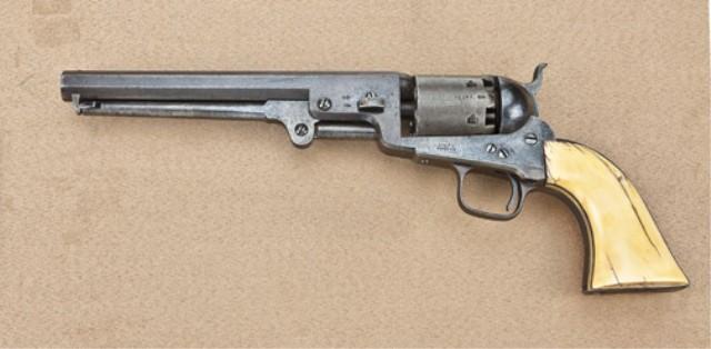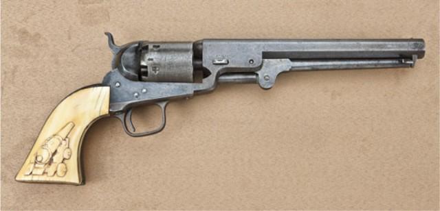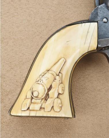 Colt 1851 Navy revolver, .36 caliber percussion, blue and case hardened finish, period carved ivory grips, London series with iron backstrap and trigger guard, serial #33591. The pistol remains in good to very good original condition showing 10-20% original blue and case hardening mixed in with a drifting brown patina finish. The cylinder shows 30-50% scene and has been lightly cleaned to a light grey with some pitting and erosion in scattered areas, mostly at the front of the cylinder. The cylinder retains all 6 original safety pins. The barrel address is sharp, the engagement dates are partially visible on the front of the cylinder. All matching original serial numbers. The pistol is fitted with period ivroty grips with brass spacer. The grips are beautifully raised carved with a ship’s cannon on the right side. The grips are absolutely genuine to the 19th century and show slight aging, cracks, and yellowing. The grips are slightly undersized but a close fit. The action is good, generally good overall. The grips make the gun and interestingly the cannon is dated 1857 on the breech. Most probably, these grips were fitted by a sailor at sea who had a remarkable ability to