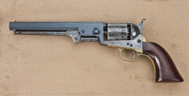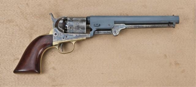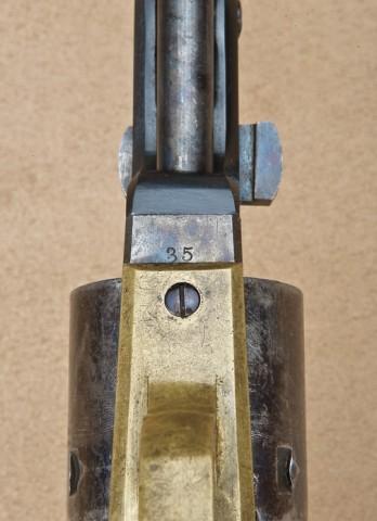 Colt 1851 Navy revolver, .36 caliber percussion, blue and case hardened finish, varnish wood grips, frame serial #35. This navy revolver is one of a number that were assembled from replacements or spare parts by Stokes-Kirk of Philadelphia, who purchased the majority of leftover percussion parts from the factory at the turn of the century. S-K sold these arms as surplus up until the wartime era. This Navy shows a near mint barrel with 95-98% bright original blue that was never barrel-addressed. There is just a couple of minor spots and a slight amount of aging on the edges. The cylinder shows British proofs, the number 5979, approx. 50-60% blue, 90% plus cylinder scene. The frame shows US and Colt’s patent with 80-90% bright case hardening, just fading slightly, mostly on the edges of the recoil shield. The backstrap and triggerguard are un-numbered Colt parts without their final polish. The varnish wood grips have been lightly refinished. The hammer shows 90% case hardening. The lever shows 75% case hardening. The small parts and screws show bright original blue. The bore is bright and shiny, and the pistol shows little to no use since assembly. The only numbered