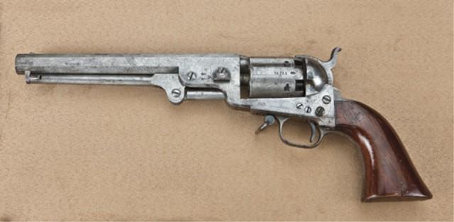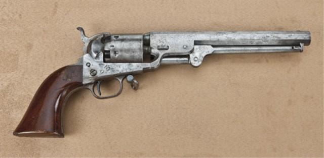 Colt 1851 Navy revolver, .36 caliber percussion, scarce 4-screw cut for shoulder stock variation, with small iron trigger guard and backstrap and sling swivel, serial #74731. The revolver shows single-line Hartford address with British proofs. The Navy remains in good original condition showing a lightly cleaned to grey patina, traces of blue and case hardening in protected areas, some scattered light to moderate erosion and pinprick pitting, with the heavier erosion occurring the right side of the frame and forward edges of barrel. The cylinder retains 30-50% original cylinder scene with mostly legible engagement dates. The trigger guard and backstrap show 40-60% heavy old original darkened silver plate. The varnish wood grips are good to very good with 75-85% varnish, some marks from attachment of shoulder stock, some wear at the edges, and normal aging. The navy shows a blade and post type front sight dovetailed into the barrel. All matching visible serial numbers, tight action, good interior. A scarce combination of variations having the small trigger guard, cut for stock, swivel, Hartford address, and British proofs. Est: $3,000 - $6,000