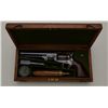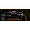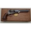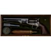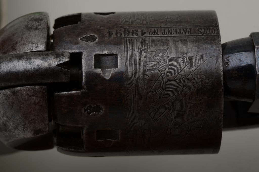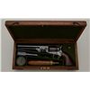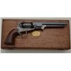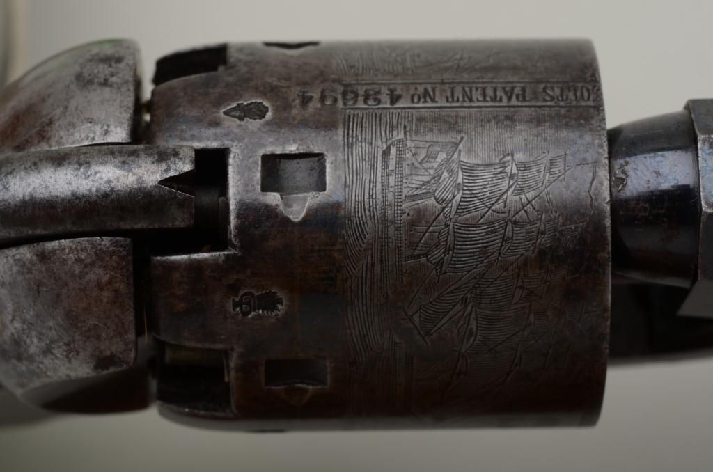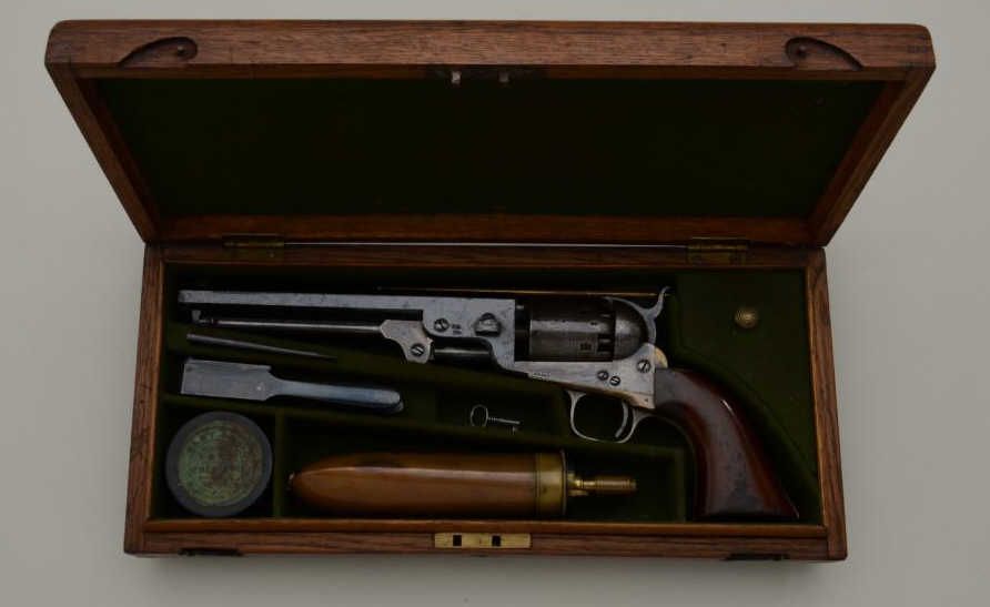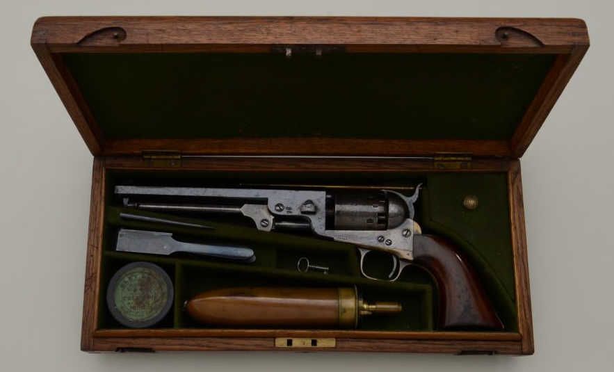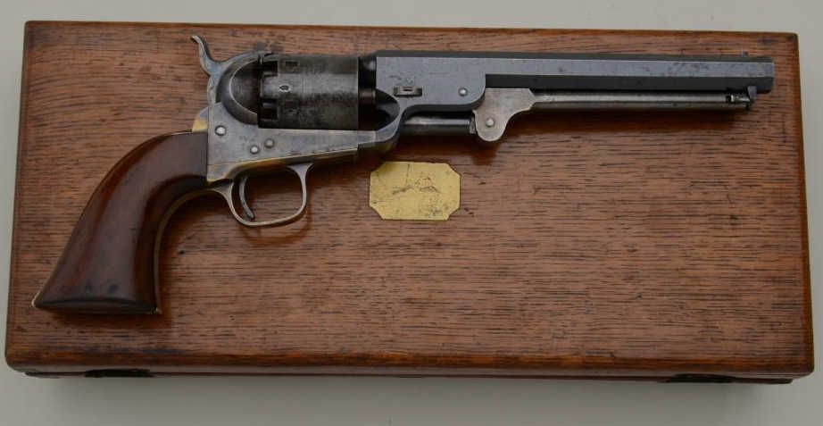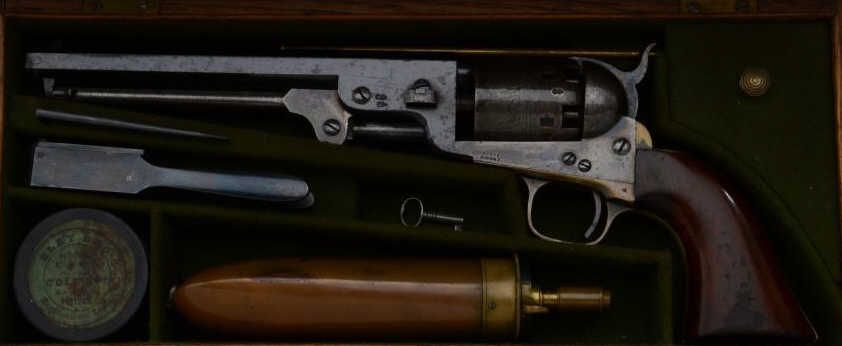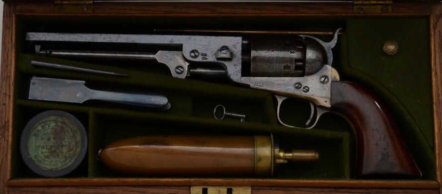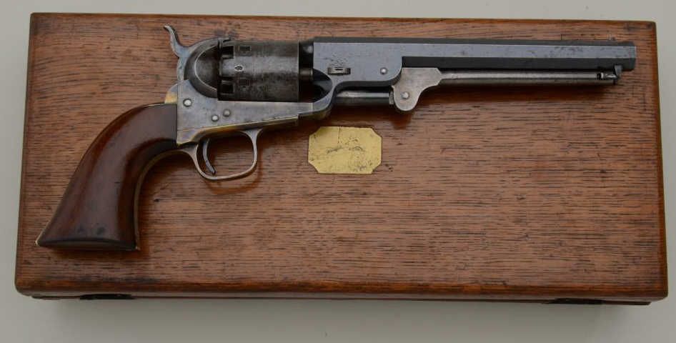 Colt 1851 Navy revolver London series with scarce brass trigger guard and original oak case. This .36 caliber percussion Navy shows London barrel address with British proofs, large brass trigger guard and is serialnumbered 42694. The barrel shows 75% to 85% original bright blue thinning at the edges with some minor scratches and just normal aging, the metal is sharp and the markings crisp. The front sight is an old handmadebrass replacement. The cylinder shows most of its original well-defined cylinder scene with sharp engagement dates. The cylinder shows traces of original blue and is crisp with a nice patina. The frame, hammer andloading lever show 50% to 70% case hardening which is aging naturally with some bright areas of rainbow colors. The backstrap and trigger guard show 20% to 40% darkened silver plate with the balance going to a naturalbrass patina. The varnished wood grips are very good plus to near fine with 75% to 85% original varnish and just slight edge wear. All matching visible serial numbers. The action is frozen. The Navy is contained