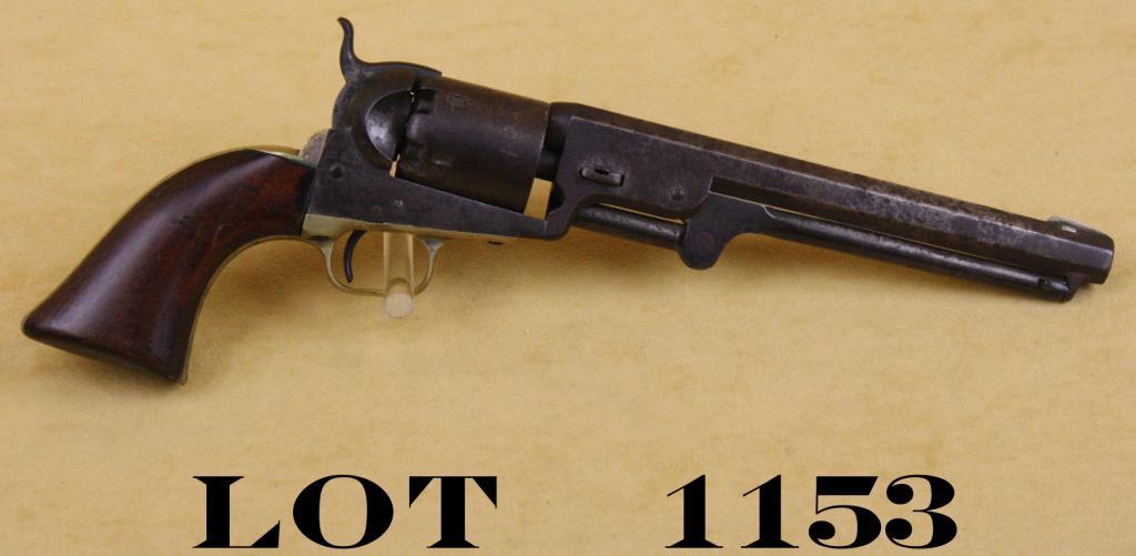 Colt 1851 Navy, small guard variation, .36 caliber percussion, serial #19887. Good overall condition, all matching serial numbers, good grips, brown patina finish. No cylinder scene, showing period added bladeand post front sight. Some pitting and erosion. Good markings, a good example of a gold-rush era favorite. Est: $800 - $1,600