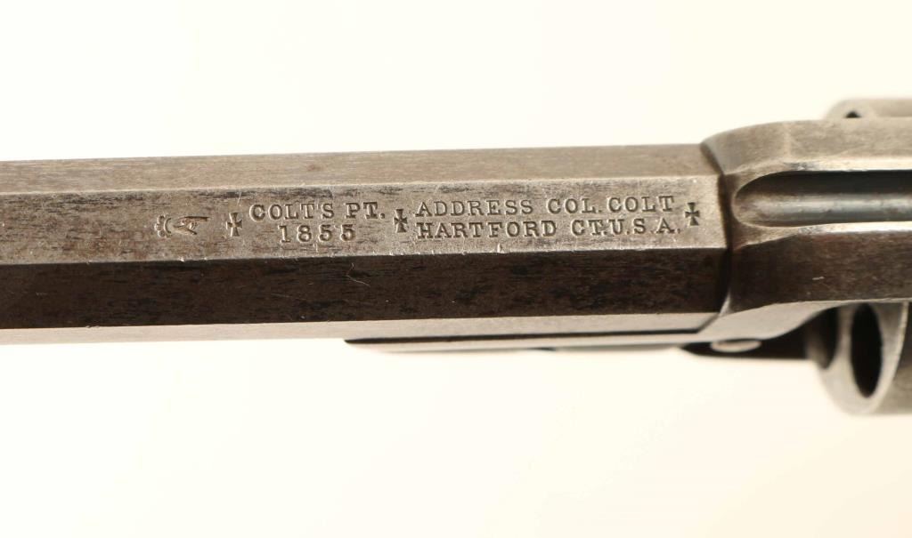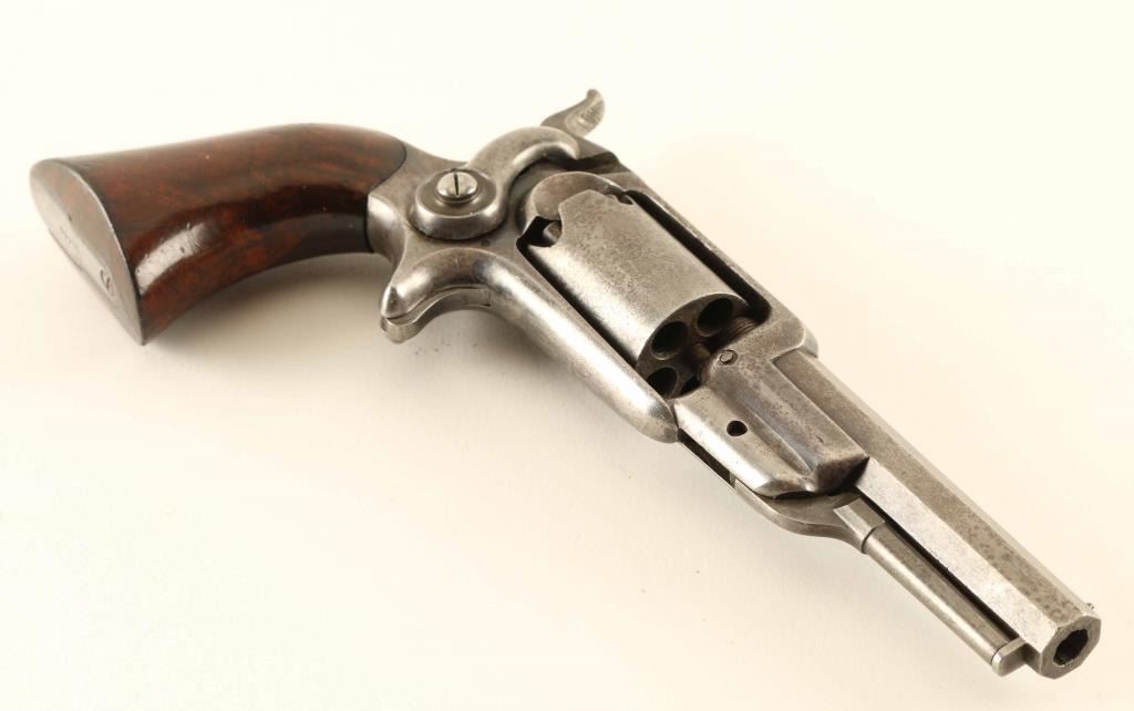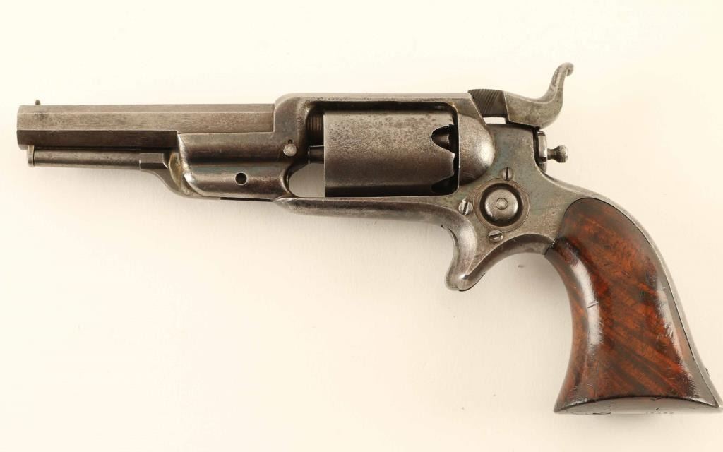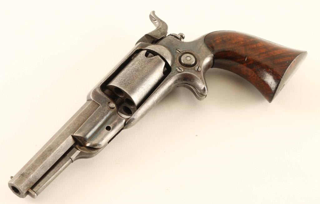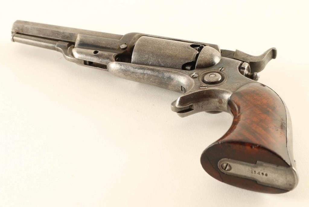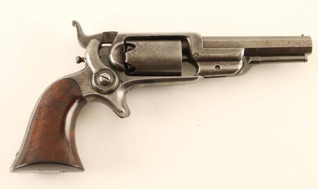 'Model 2 Root' Antique American made single action spur trigger percussion revolver chambered for .28 caliber ammunition, manufactured circa 1856(second year production). Features a high polished blued finish, 3 1/2" octagonal barrel with pointing hand two line patent markings & address, part octagon loading lever, brass cone front sight, 'v' notched rear sight, non-fluted five shot cylinder with roll stamped "Cabin & Indian" scene, smooth spur trigger, side mounted hammer with knurled spur, and one-piece vanished wraparound burl walnut grip. All observed serial number match including the frame, cylinder and barrel. Revolver exhibits approximately 10% of it's original bluing while the balance of the metal surfaces display a smooth grey patina and the cylinder retain approximately 50% of it's scene. Action is sound, the bore appears very good, markings are crisp and the wood grip is good to very good with crack in the toe & scattered blemishes. Condition is NRA Very Good. ***Antique Firearm***