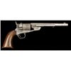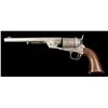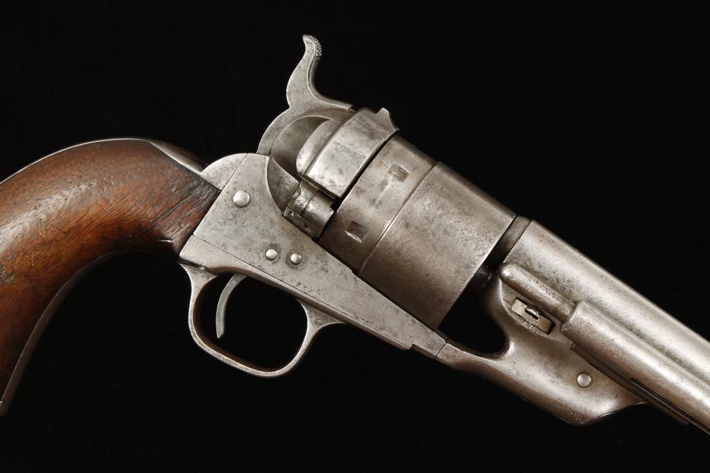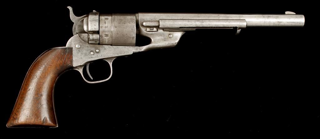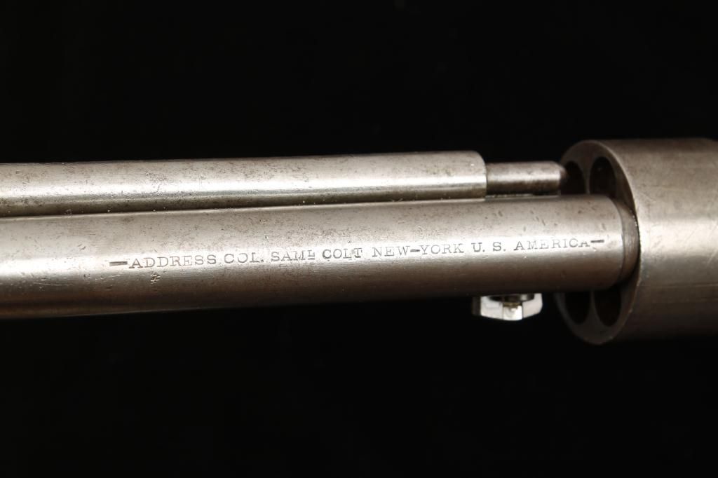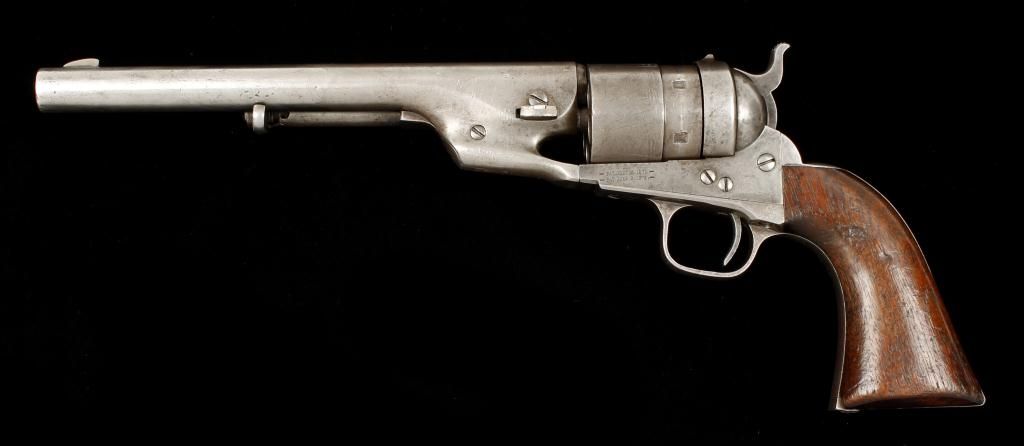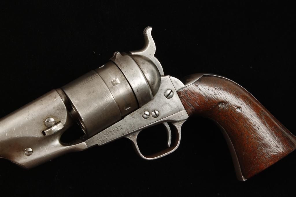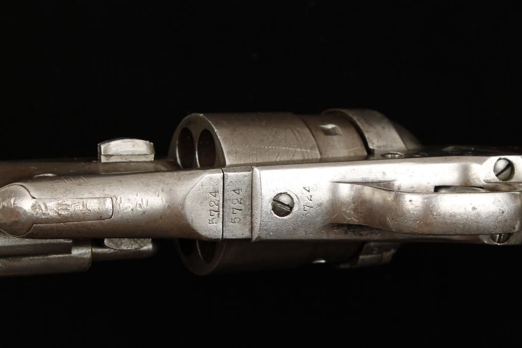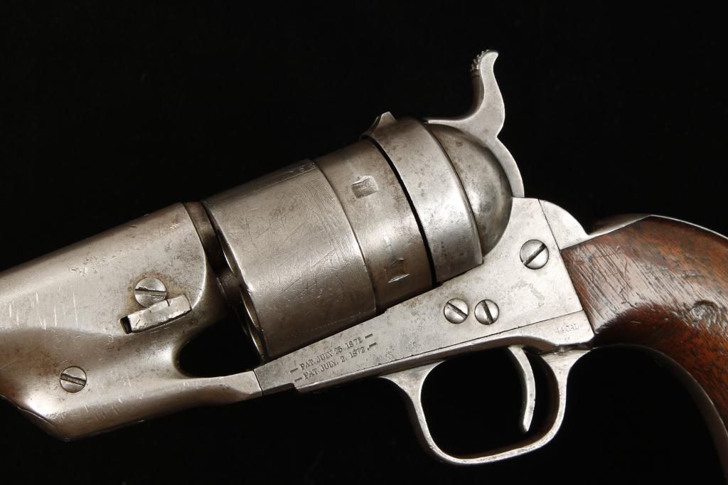 Colt 1860 Army 1st Model Richards conversion .44 center fire Colt caliber, showing 1871-1872 patent dates, iron back strap and trigger guard, serial number 5724 made in its own serial number range as a cartridge armusing left over percussion parts. This revolver shows traces of original blue and case hardening within a light gray patina and there has been some minor cleaning long ago. There is some scattered light to moderatepitting and erosion. The front sight has been slimmed about halfway down. The cylinder shows 50% to 70% original cylinder scene with partially visible engagement dates on the edge. The grips are good with some notches at the edges and small losses along with general aging. All matching visible serial numbers. Good markings, good overall with tight action and good bore. Est.: $2,500-$5,000.