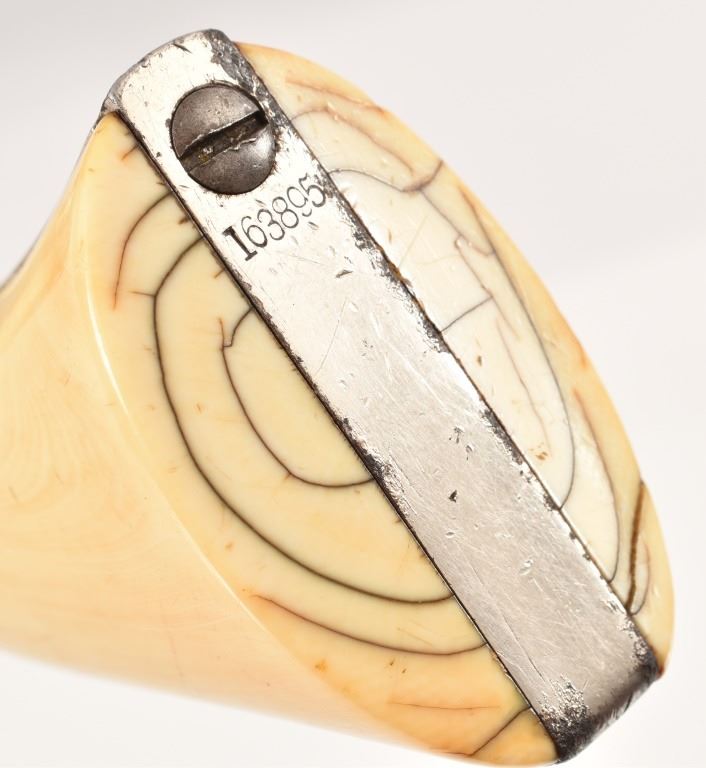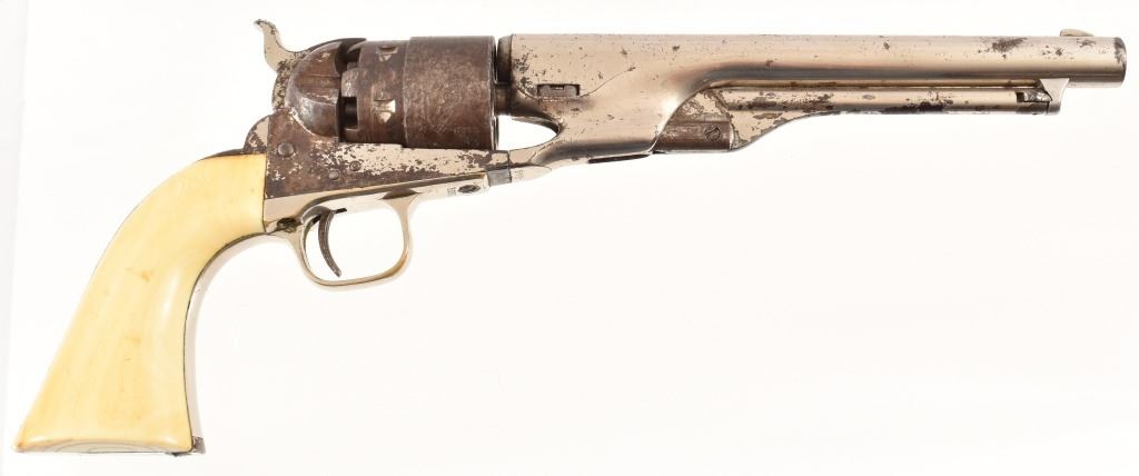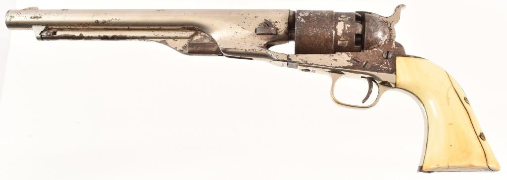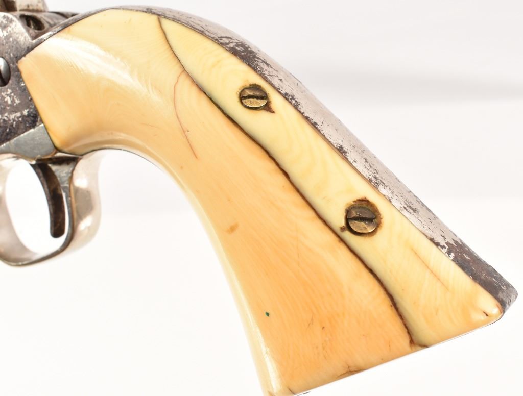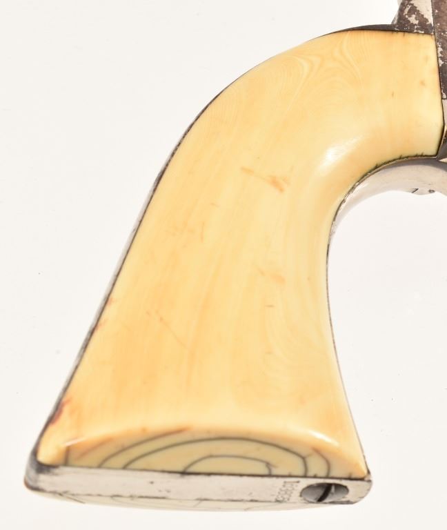 Nickel plated, period ivory grips with period repair using brass screws. 8" barrel. SN 163895