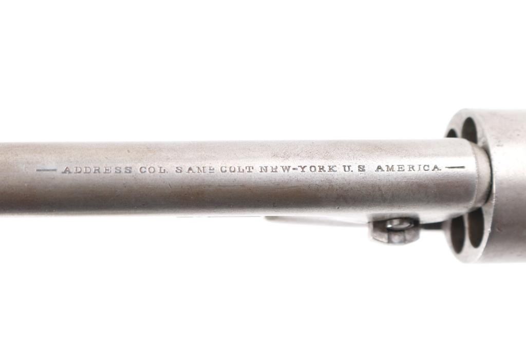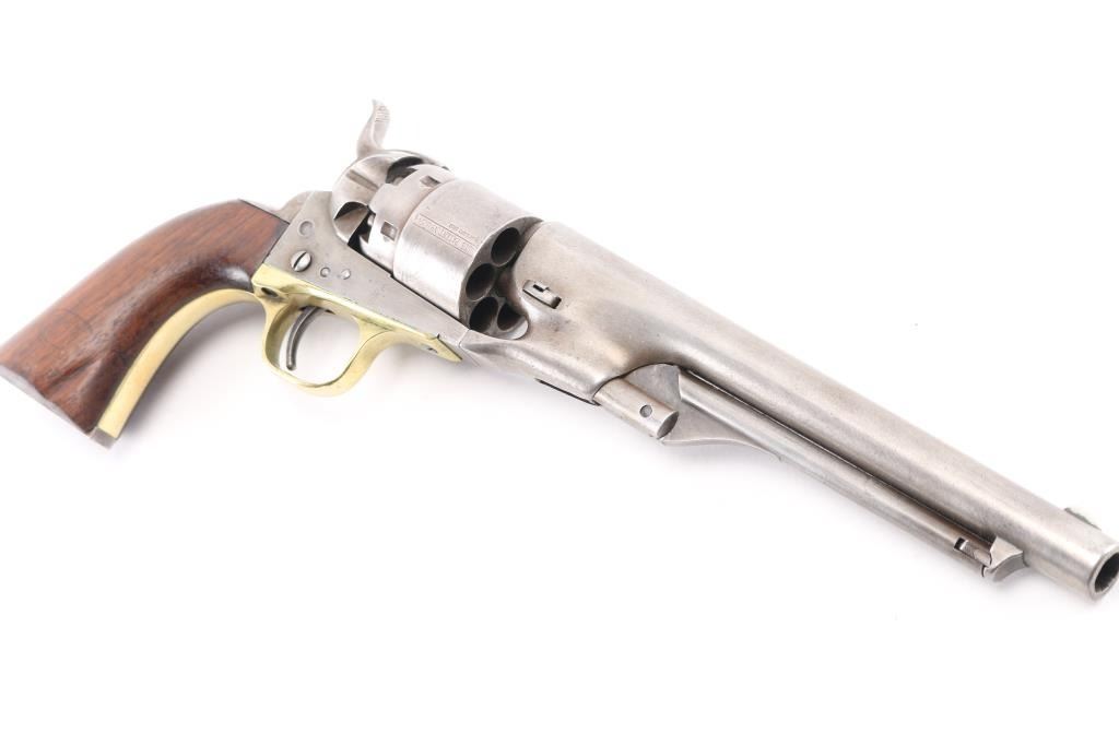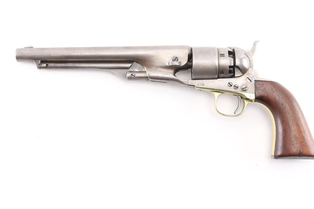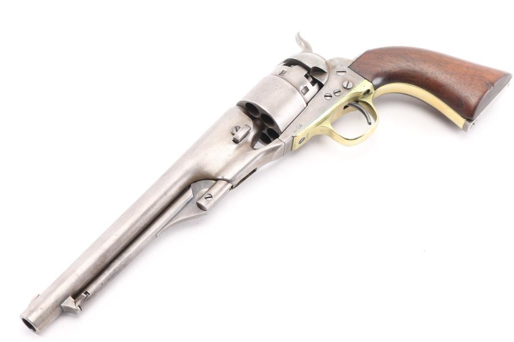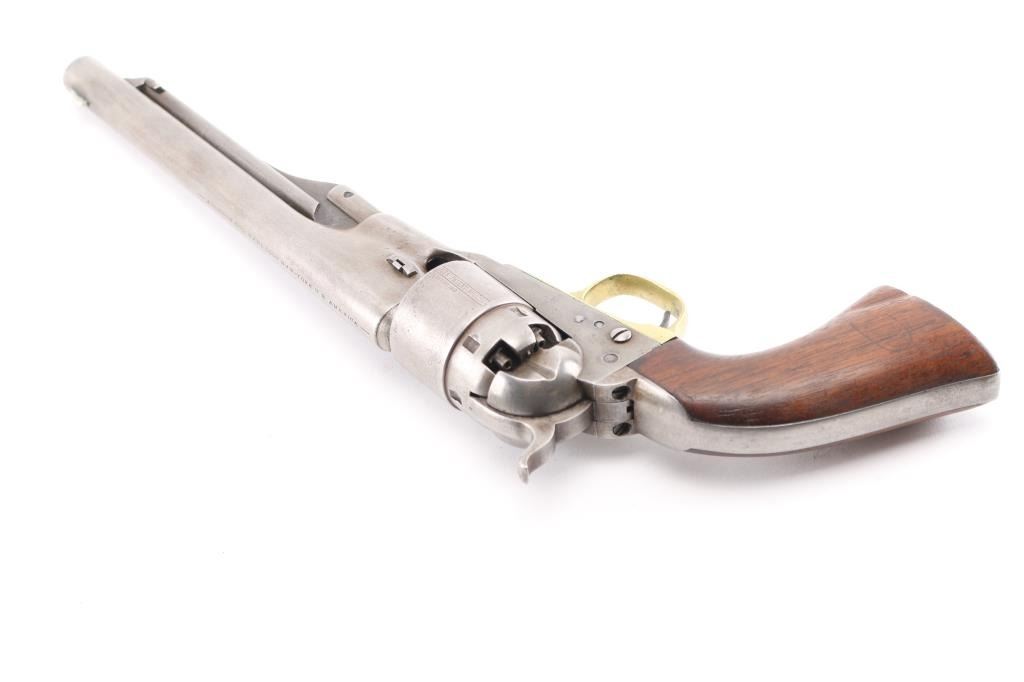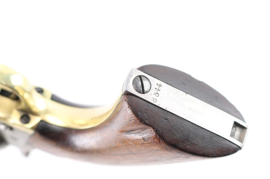 "Four Screw Military Frame" Antique single action cap-n-ball black powder percussion revolver. Early manufacture, circa 1861. Features an 8" round barrel, German silver blade front sight, 'v' notch rear sight cut into the hammer lip, smooth thin trigger, knurled hammer spur, non-fluted six shot cylinder with roll stamped Naval Engagement scene, loading lever, round brass trigger guard, steel backstrap, shoulder stock cuts in the recoil shield & butt and one-piece oil finished smooth walnut grip. Bore is good, fairly bright with sharp rifling, some light frosting or pitting throughout. Metal surfaces show a uniform dull gray or silver color, appears cleaned, with very light roughness from previous patina. Wood grip is good with slight shrinkage, several small chips or gouges. Right side of grip has remnants of an inscription in a large oval, too faint to read. Cylinder scene is visible although faint. Single line barrel address is fairly crisp. Serial number repeated on barrel, cylinder, triggerguard & back strap. Action is sound. Condition is NRA Very Good *** Antique Firearm ***