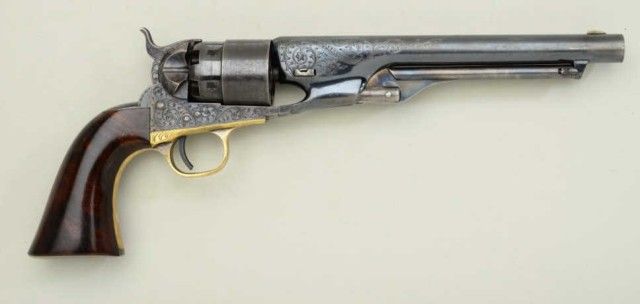 Colt 1860 Army 44 caliber percussion revolver fully and finely factory open vine scroll engraved with blue and case hardened finish, burl wood grips, serial #151699. The barrel retains 85-95% bright original blue with just some minor drifting and beginning age. The cylinder shows 60-80% thinning blue that is still very bright on the back ring and fading on the front of cylinder. About 75% light original scene remains with clear patentdates. The frame retains 85-95% case hardening and hammer shows 50-70% case hardening both slightly dulling and going to a natural patina with good rainbow colors. The trigger guard shows traces of silver andthe back strap shows about 10% bright blue mostly on the top behind the hammer. The edges are crisp and the markings are sharp. The ram rod shows 75-85% bright original case hardening. The bottom of the barrel beneath ram rod shows inky and bright color blue. The Colt is fitted with deluxe burl walnut grips that are in fine condition and fit impeccably and show just a few scratches and light marks. All matching visible serial