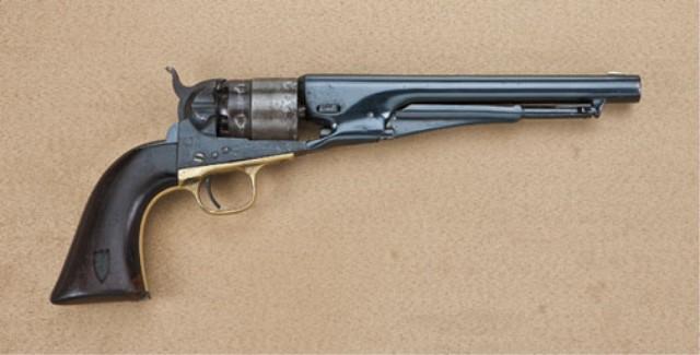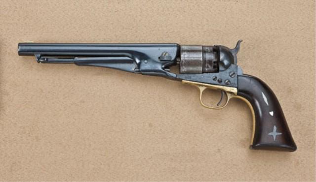 Colt 1860 Army Revolver, .44 caliber percussion, 4-screw cut for shoulder stock, refinished, pewter inlaid grips, with associated parts, serial #20464. The barrel is stamped 80464, and the dye stamps do not seem to be Colt and do not seem to match. The loading lever is converted from a Remington. The grips are refinished, and show a loss at bottom of front grip. The right grip shows the inlay of a Union style shield, the left grip shows two pewter inlays and a small German Silver inlay in the Civil War style. The barrel was heavily buffed, and address missing. The frame shows dents under the refinish. The cylinder shows hard use and cleaning, and the hammer is very heavily used in almost relic condition. The action is working, the bore is fair, a 1950’s restoration of a heavily used Civil War revolver replacing lost parts and screws, and a somewhat amateur restoration. Est: $350 - $700