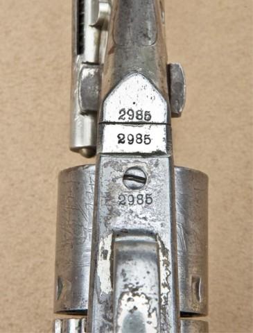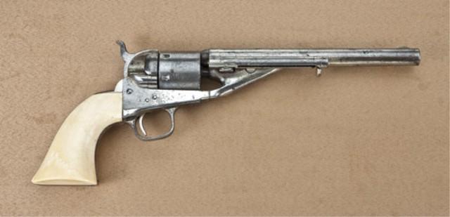Colt 1861 Navy (Conversion) to .38 rimfire cartridge showing 1871/72 patent dates. Recoil shield and loading gate. Ejector rod and housing added to side of barrel. Iron backstrap and trigger guard. Serial numbered in own range, serial #2895. This Richards Mason type conversion was actually made as a cartridge arm, utilizing leftover percussion parts and iron backstrap and triggerguard probably returned from London agency. Refer Flayderman 5B-124. The barrel shows plugge ramrod hole and approx. 20-30% original nickel drifting to grey with some scattered light to moderate surface pitting, some darkening where the nickel has lifted and some slightly heavier of pitting in a few scattered small spots. The ejector rod housing shows traces of nickel, light to moderate pitting, and some heavier pitting toward the front half-inch. The cylinder shows 30-60% original cylinder scene and engagement dates at front edge. Approx. 10-20% original nickel and generally smooth patina on the cylinder with a couple of nicks, and normal aging. The frame shows 50-70% original nickel that is evenly drifting and toning. The backstrap and trigger guard show 50-60% toning nickel. The revolver has