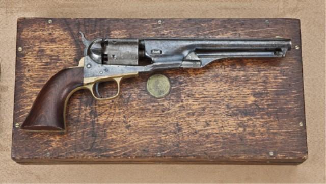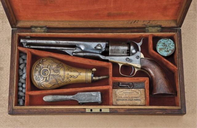 Colt 1861 Navy revolver, .36 caliber percussion, blue and case hardened finish, military style unvarnished wood grips, serial #7112. In original to the period velveteen-line partition style oak case with accessories. The revolver remains in very good original condition with 30-50% original blue on barrel which is military type with some scattered light to moderate erosion, some slightly or heavier pitting at forward 3” on left side toward the muzzle. The barrel address is good and sharp, there is some very good blue. The cylinder shows 20-30% original light cylinder scene with engagement dates legible on edge. The cylinder has gone to a light grey to brown patina with scattered light to moderate surface pitting and some feint traces of blue. The frame shows 20-30% case hardening within a silvery grey to brown patina with some rainbow colors faintly visible. The hammer shows 10-20% case hardening. The loading lever shows 30-50% case hardening. The military type wood grips show an “L” inspector’s type mark on the bottom of the right grip, but no final cartouche. Grips are fine to near excellent with a couple of nicks at the edges, small losses, near excellent overall with impeccable fit. Al