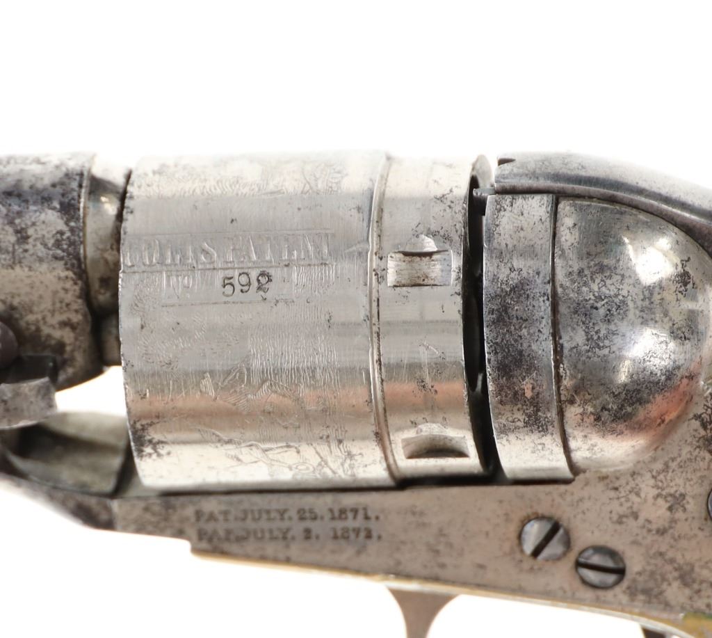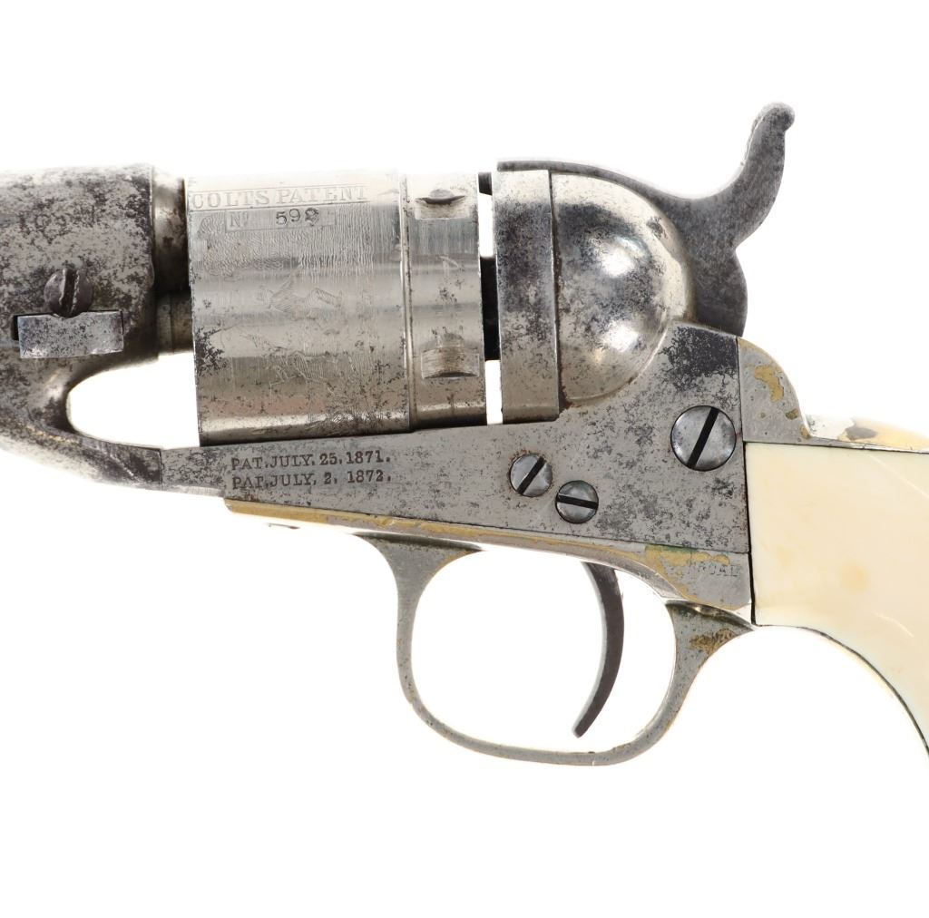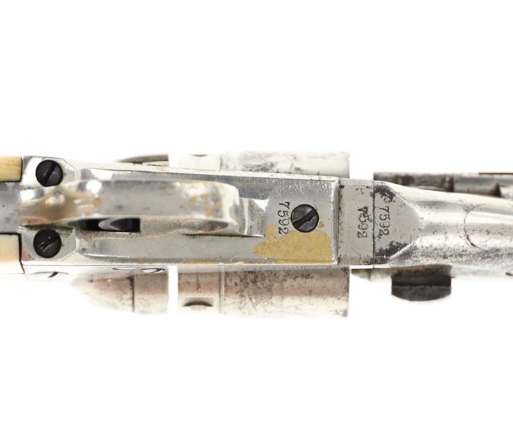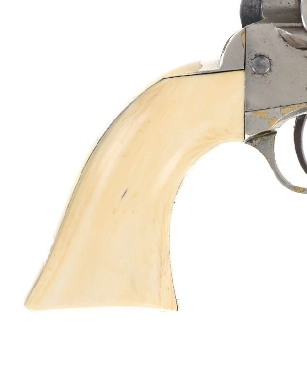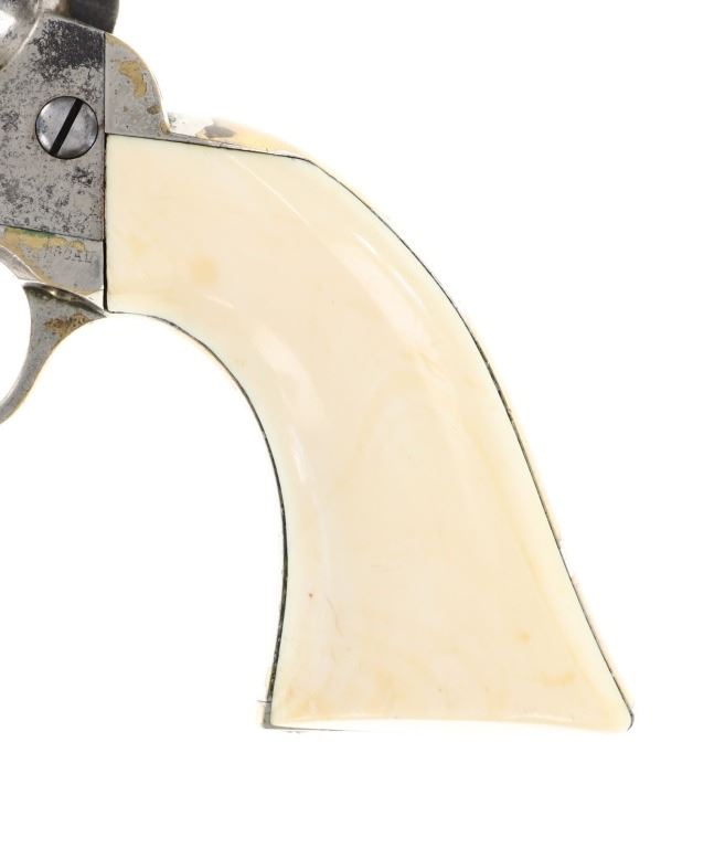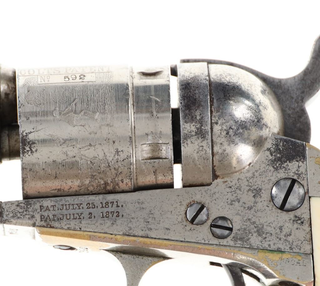 showing no cracks or chips. The nickel plating is very fine overall with only some light oxidation/peeling mainly on some portions of the left side of the barrel and bottom portions of the ejector housing along with a few small spots on the frame. There is still good nickel on the brass grip straps with minor peeling on the front strap and additional peeling on the back strap to reveal an uncleaned brass underneath (usually all the plating is gone from the grip straps). Additionally, the screw heads are generally excellent. The cylinder retains the original crisp and sharp roll marked stagecoach hold up scene The Colt barrel address is sharp as are the correct 1871 and 1872 patent markings on the left side of the frame. The upper left portion of the trigger guard retains the correct “36 CAL” marking from the earlier percussion manufacture parts. This example also has the desirable loading gate feature that many conversions lack, and it too retains excellent nickel. With ivory grips and nickel plating, this original Colt has a most attractive quality. Its rarity, overall condition and ivory stocks put it in a category suitable for the most advanced collection. The pistol weighs 1lb 8oz. Serial Number: 7592. This firearm qualifies as an Antique, and does not require FFL Transfer or NICS Background Check.