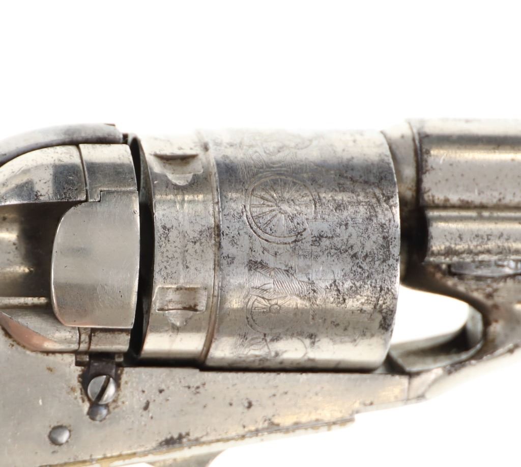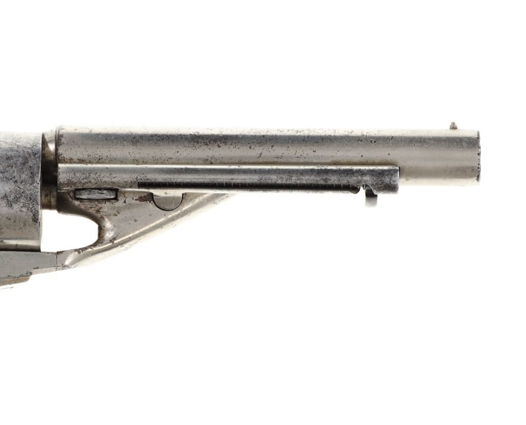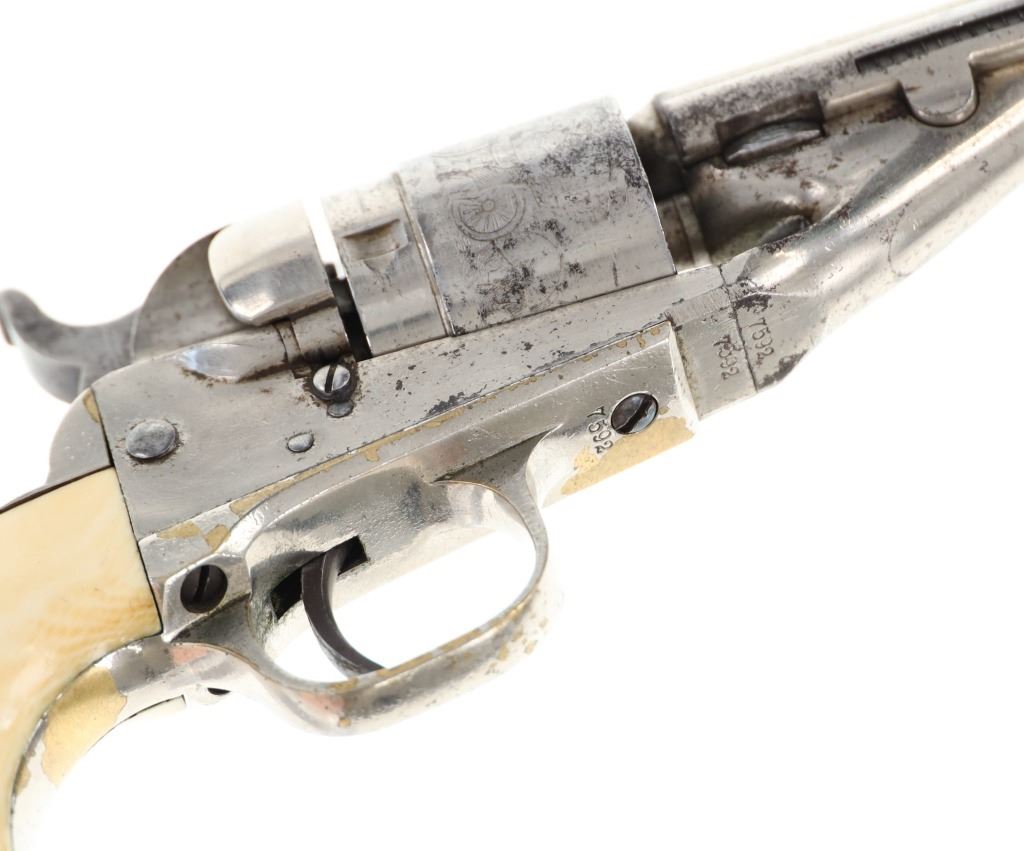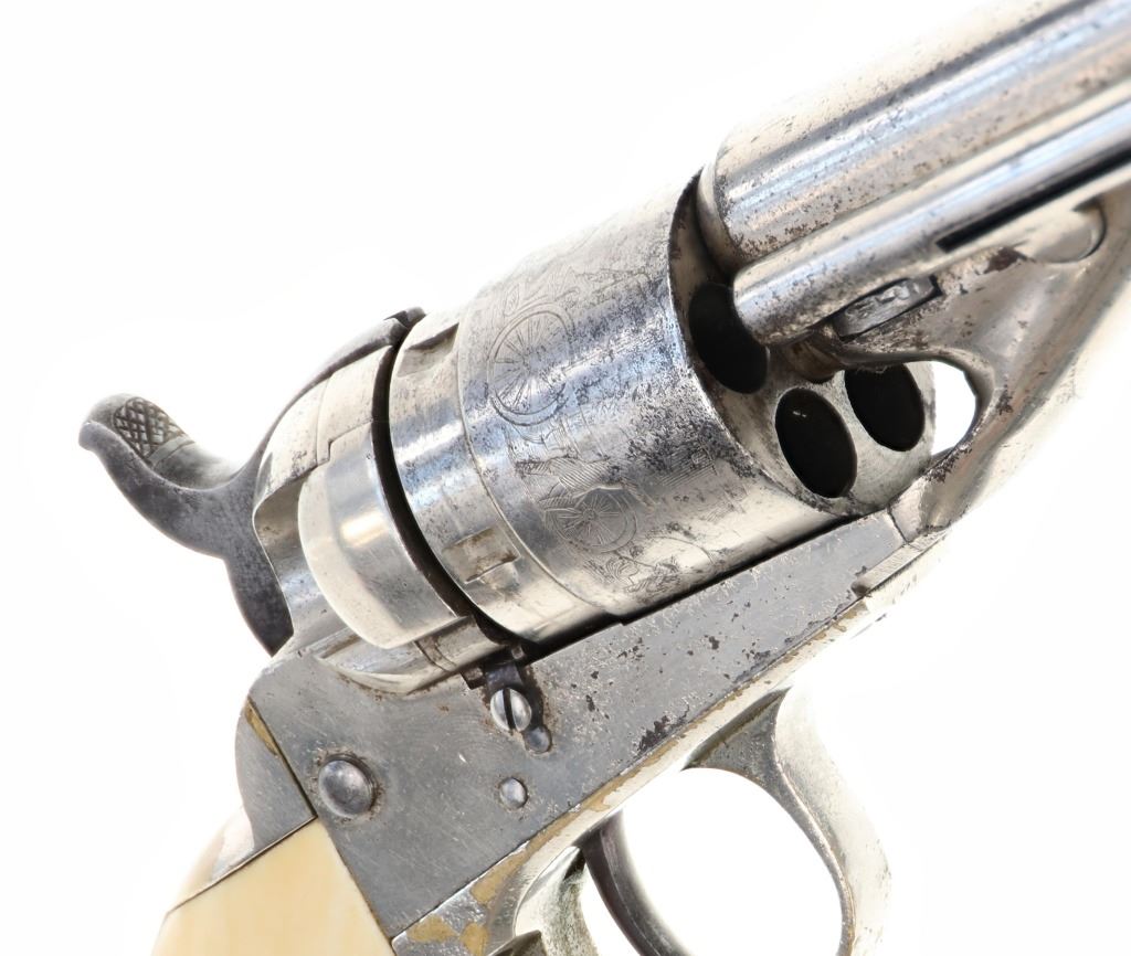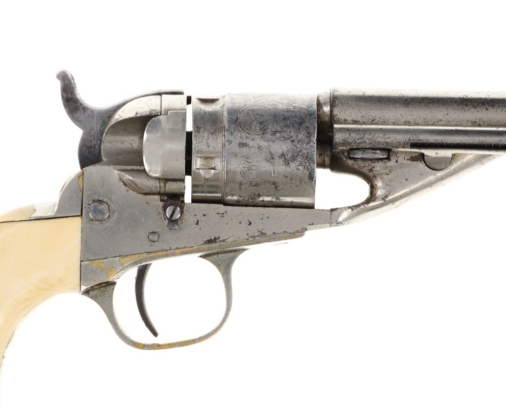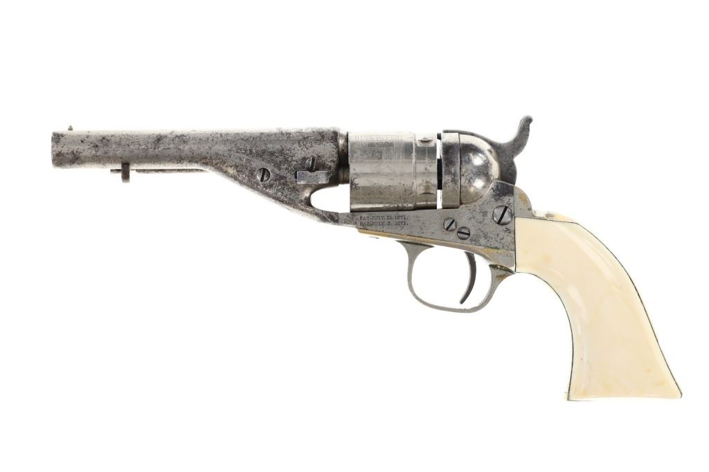 showing no cracks or chips. The nickel plating is very fine overall with only some light oxidation/peeling mainly on some portions of the left side of the barrel and bottom portions of the ejector housing along with a few small spots on the frame. There is still good nickel on the brass grip straps with minor peeling on the front strap and additional peeling on the back strap to reveal an uncleaned brass underneath (usually all the plating is gone from the grip straps). Additionally, the screw heads are generally excellent. The cylinder retains the original crisp and sharp roll marked stagecoach hold up scene The Colt barrel address is sharp as are the correct 1871 and 1872 patent markings on the left side of the frame. The upper left portion of the trigger guard retains the correct “36 CAL” marking from the earlier percussion manufacture parts. This example also has the desirable loading gate feature that many conversions lack, and it too retains excellent nickel. With ivory grips and nickel plating, this original Colt has a most attractive quality. Its rarity, overall condition and ivory stocks put it in a category suitable for the most advanced collection. The pistol weighs 1lb 8oz. Serial Number: 7592. This firearm qualifies as an Antique, and does not require FFL Transfer or NICS Background Check.