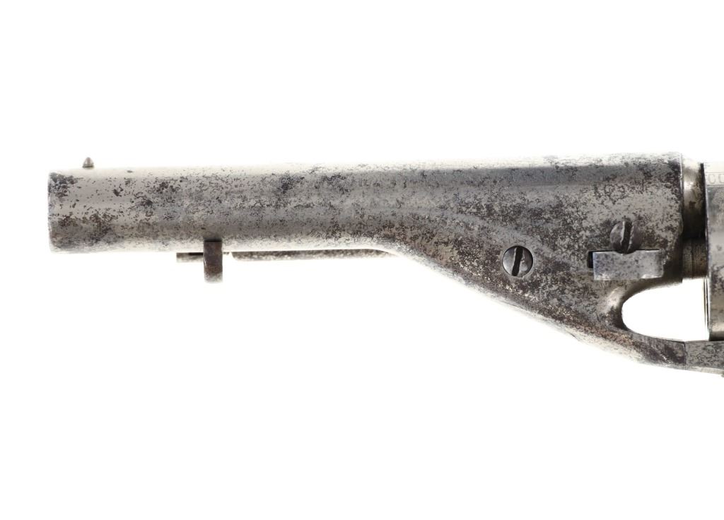 Colt 1862 Police & Pocket Navy cartridge conversion revolver with ejector. This rare model was only made in a quantity of 6500 from 1873-1875. Barrel lengths were 4 ½” to 6 ½” and all had five shot cylinders. Made from left-over percussion revolvers, these scarce conversions were some of Colt’s earliest cartridge firing revolvers. With only 6500 made approximately 150 years ago, survival rates for this model are small, and those in fine condition have even smaller survival rates. This fine example with 4 ½” barrel in .38 Rim Fire caliber with serial number 7592 has all matching numbers on the frame, barrel, cylinder and trigger guard. Even the barrel wedge has the matching number serial number. It is fitted with superb mellow antique one-piece ivory grips that are in perfect condition