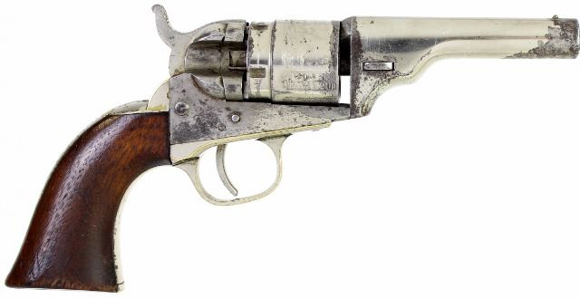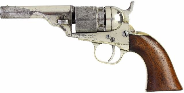 Colt 1862 .38cf cal. SN 327XXX conversion revolver3 1/2" round barrel, nickel finish with one piece walnut grips, a very nice example showing 60-70% nickel, sharp 2 line Hartford and patents on barrel and frame, strong stage coach cylinder scene, the serial numbers all matching, walnut grips remain fine with excellent fit to metal, NO loss or repairs, mechanically tight, perfect functioning action with very good to fine bore, made 1873-1880. Antique. Est. 1500-2000
