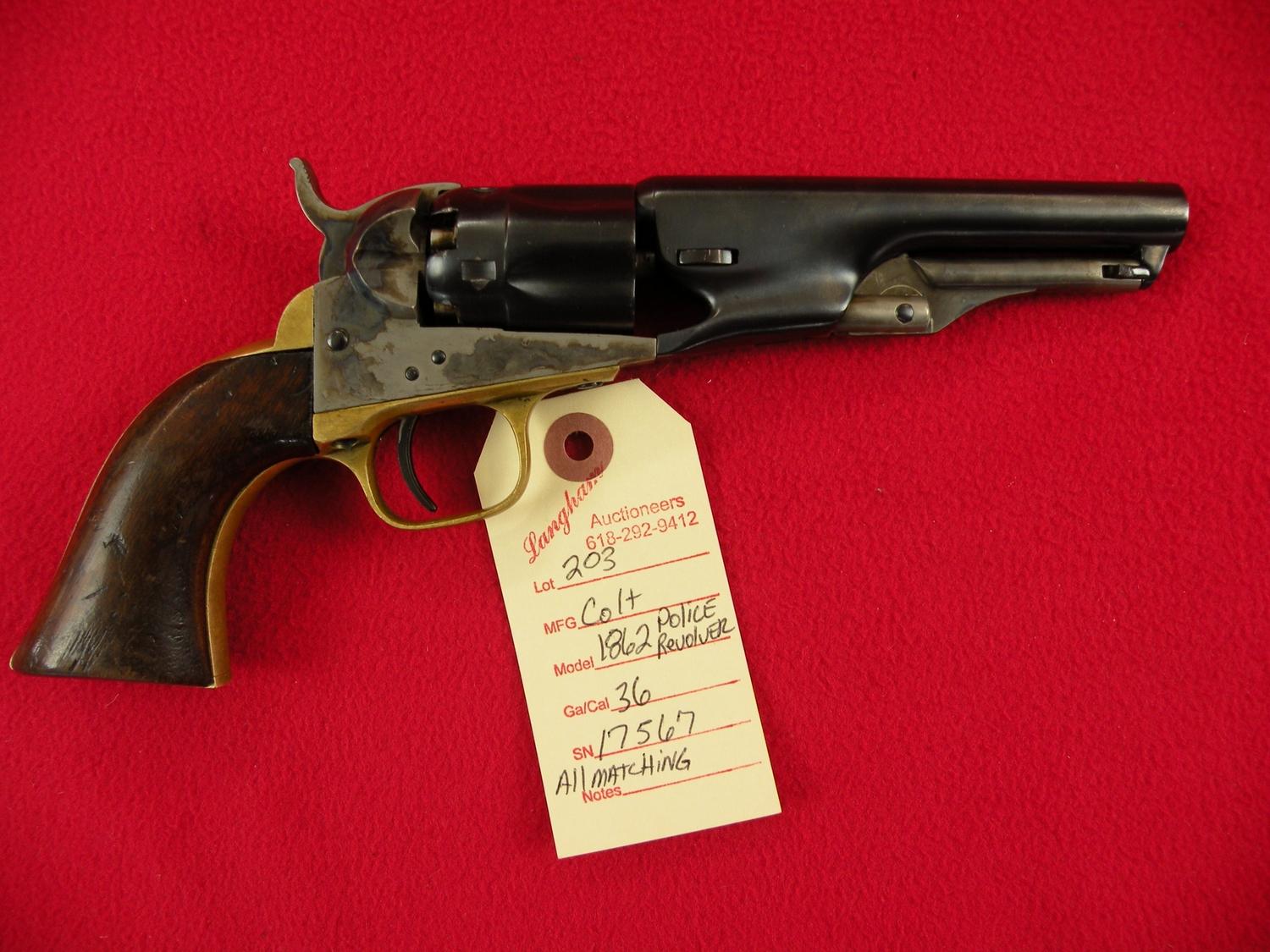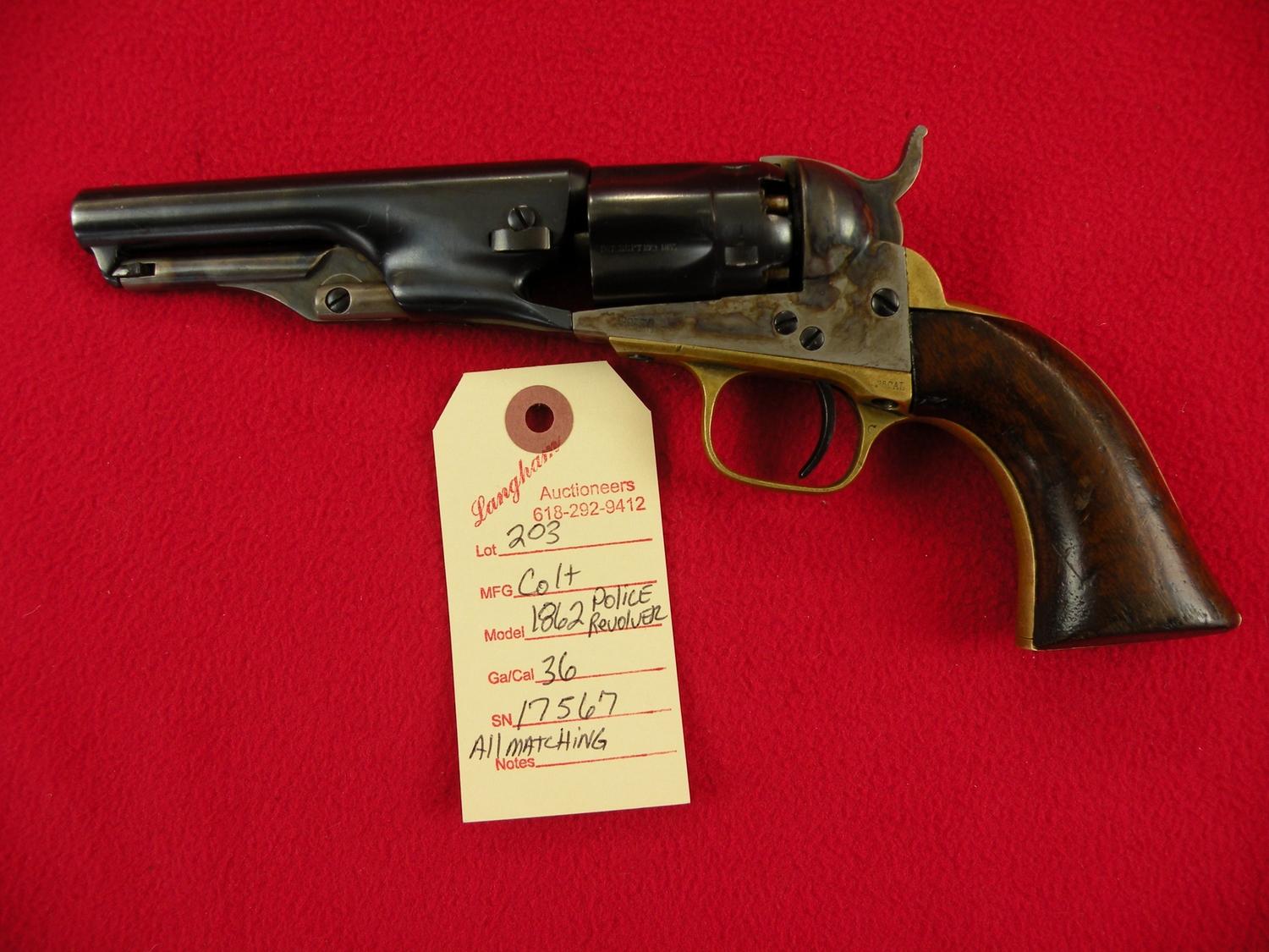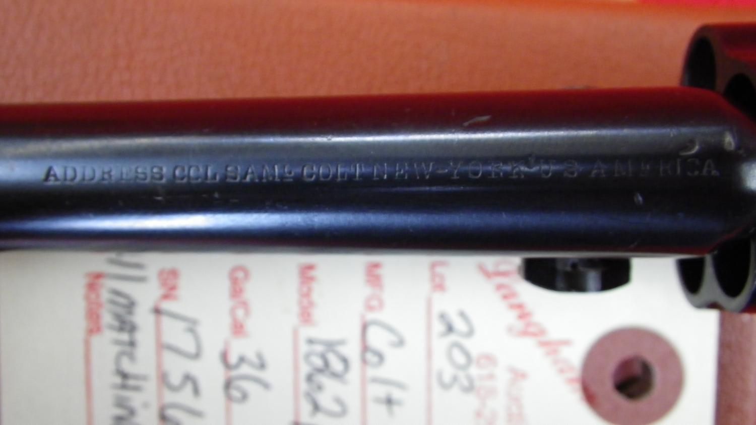 Frame, Hammer And Loading Lever Case Colored,Barrel And Cylinder Blued, Barrel Stamped "Address Col. Sam Colt New-York U.S.America", Left Side Of Frame "Colts/Patent", Cylinder Stamped "Pat. Sept. 10 1850", Many Were Converted To Metalic Cartridge use, So They Are Quite Scarce On Today's Market, SN 17567
